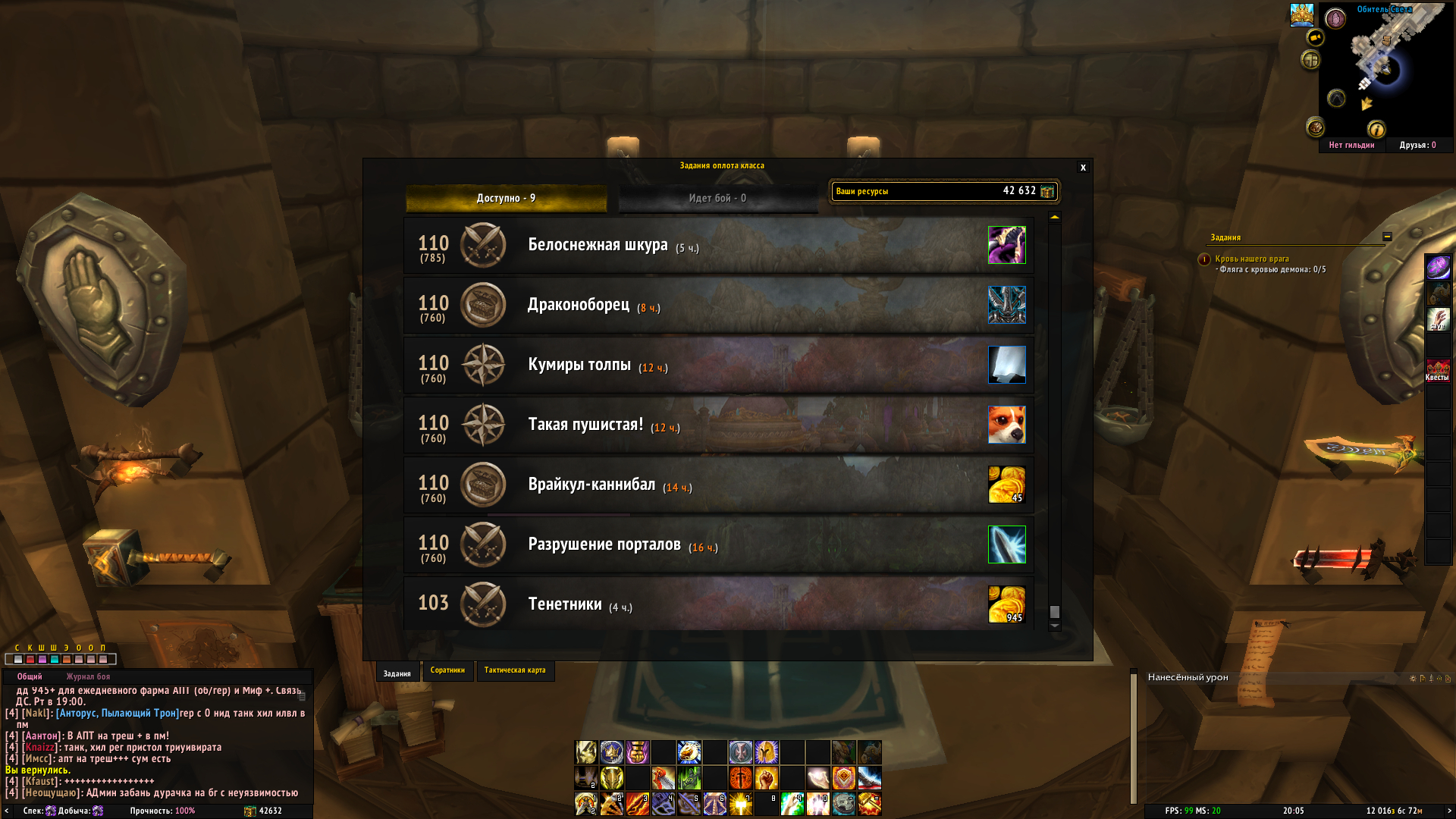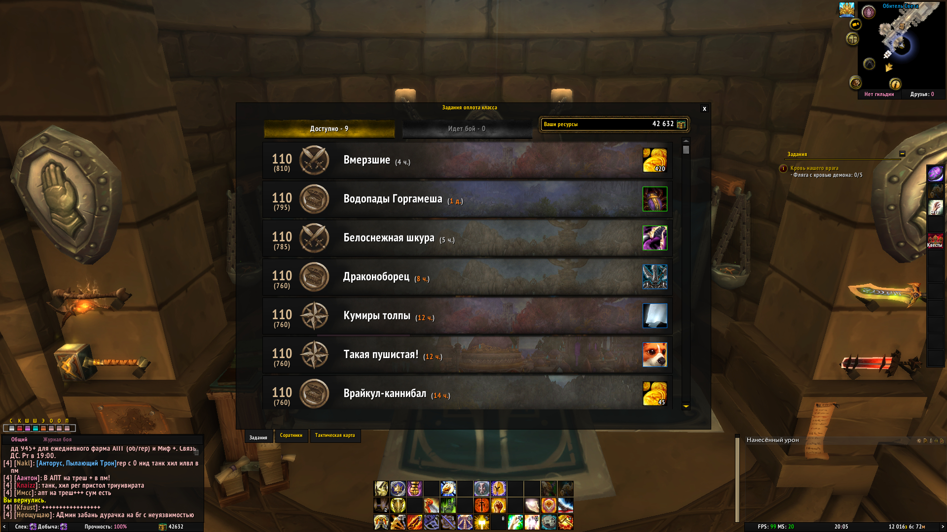 DescriptionПроходила цепочку квестов на кампанию паладина, дошла до квеста https://ru.wowhead.com/quest=43488 Отправила соратников на задание , но получилось выполнить только 3 из 5, четвертое задание провалилось. После этого они не появлялись на тактической карте. Пробовала отменить квест и взять заново, релогалась, чистила кэш, исправляла персонажа в лк, пробывала эти махинации с релогами, чистками и тд.,но нужные задания на кровь так и не появились!