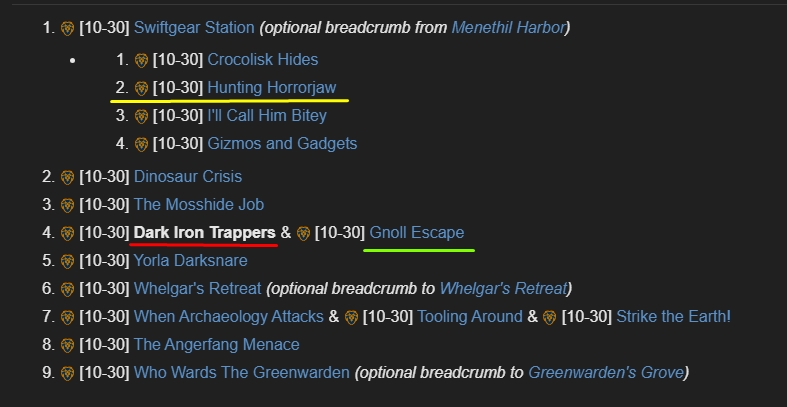 | Description | Легион плюс. Восточные королевства - Болотина. Альянс. Култирасец, шаман Совершенствование Квест доступен сразу, без преквестов. На скринах выделил квесты которые не должны быть доступны красным и зеленым цветом, а желтым подчеркнул квест который я сейчас делаю. Кроме них надо проверить остальные квесты на последовательность. Пруф: https://wowpedia.fandom.com/wiki/Dark_Iron_Trappers | ||||