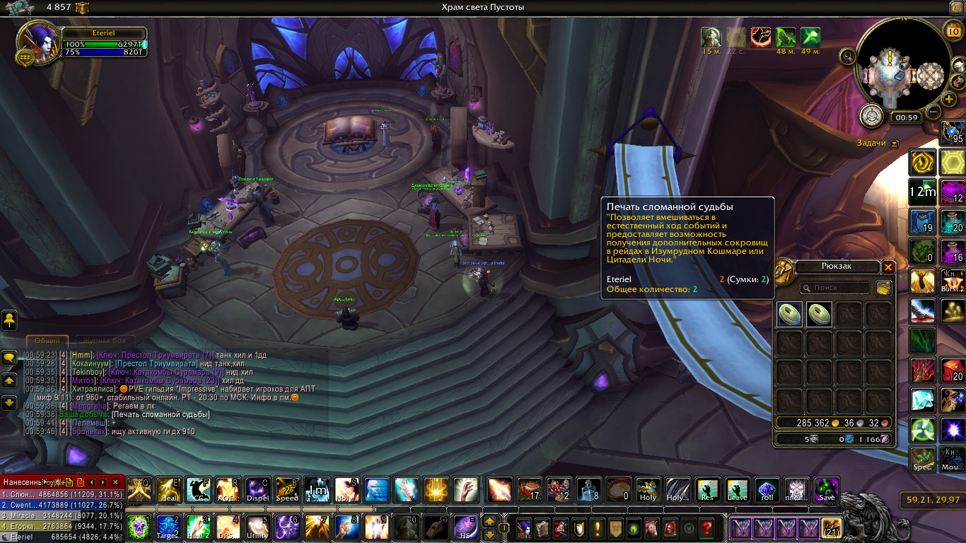 Лок: Не работает: https://ru.wowhead.com/order-advancement=366/демоническое-подношение https://ru.wowhead.com/order-advancement=360/ритуал-призыва ("работает" визуально при формировании группы, но при запуске длительность миссии остается не сокращенной) https://ru.wowhead.com/order-advancement=364/пакт-тьмы https://ru.wowhead.com/order-advancement=361/тренировочная-площадка https://ru.wowhead.com/order-advancement=365/гримуар-рабства https://ru.wowhead.com/order-advancement=362/темная-искусность Высвобождение инфернала (без ссылки, т.к. его на бфа заменили) https://ru.wowhead.com/order-advancement=510/беспощадные-демоны https://ru.wowhead.com/order-advancement=511/дополнительный-защитник Не могу проверить: https://ru.wowhead.com/order-advancement=359/призыв-стража-ужаса (т.к. шансы миссий сломаны сами по себе) https://ru.wowhead.com/order-advancement=358/темная-сделка (без понятия как проверять) https://ru.wowhead.com/order-advancement=363/жуткий-урожай (т.к. не работают боевые спутники) Работает: https://ru.wowhead.com/order-advancement=368/легенды-скверны Дух Армии погибели Легиона (не совсем правильно, должны итемы давать в 2 раза больше, вместо этого иногда дает 2 итема вместо 1) Дх: Не работает: https://ru.wowhead.com/order-advancement=419/круговерть-пустоты https://ru.wowhead.com/order-advancement=422/оружие-скверны (NPC появляется и выполняет заказы, вот только выдает какой-то мусор) https://ru.wowhead.com/order-advancement=418/демоническая-сила https://ru.wowhead.com/order-advancement=417/наги-мирмидоны https://ru.wowhead.com/order-advancement=421/гнев-молота-скверны (эффект другой, на бфа заменили) https://ru.wowhead.com/order-advancement=490/дополнительный-защитник https://ru.wowhead.com/order-advancement=489/клинки-смерти Не могу проверить: https://ru.wowhead.com/order-advancement=414/охота (т.к. шансы миссий сломаны сами по себе) https://ru.wowhead.com/order-advancement=413/полная-готовность (без понятия как проверять) https://ru.wowhead.com/order-advancement=415/коварное-отступление (т.к. шансы миссий сломаны сами по себе, "работает" визуально при формировании группы) Пока не проверял: https://ru.wowhead.com/order-advancement=416/тренировочная-площадка https://ru.wowhead.com/order-advancement=420/высокая-боеготовность Работает: https://ru.wowhead.com/order-advancement=423/судьба-демона Дух Армии погибели Легиона (на самом деле плохо помню, мб и не работает, но вроде бы как у лока - дает 2 итема вместо одного иногда) По поводу https://ru.wowhead.com/order-advancement=452/алтарь-благословения - когда первый раз попал в оплот, оба колодца были доступны одновременно (хотя апгрейда, на тот момент, конечно, не было), на полученных с них итемах было написано, что исчезнут через 18ч - но не исчезли, время вообще не уменьшалось. Больше колодцы не появлялись P.S. Дополнительный слот защитника также должен даваться за https://ru.wowhead.com/achievement=11846/защитники-армии-погибели-легиона - всего 6 доступных, и уже потом улучшение оплота должно давать 7 слот. У нас не выдаются оба слота https://ru.wowhead.com/order-advancement=499/дополнительный-защитник#english-comments https://www.wowhead.com/achievement=11846/champions-of-legionfall#comments:id=2486402 |