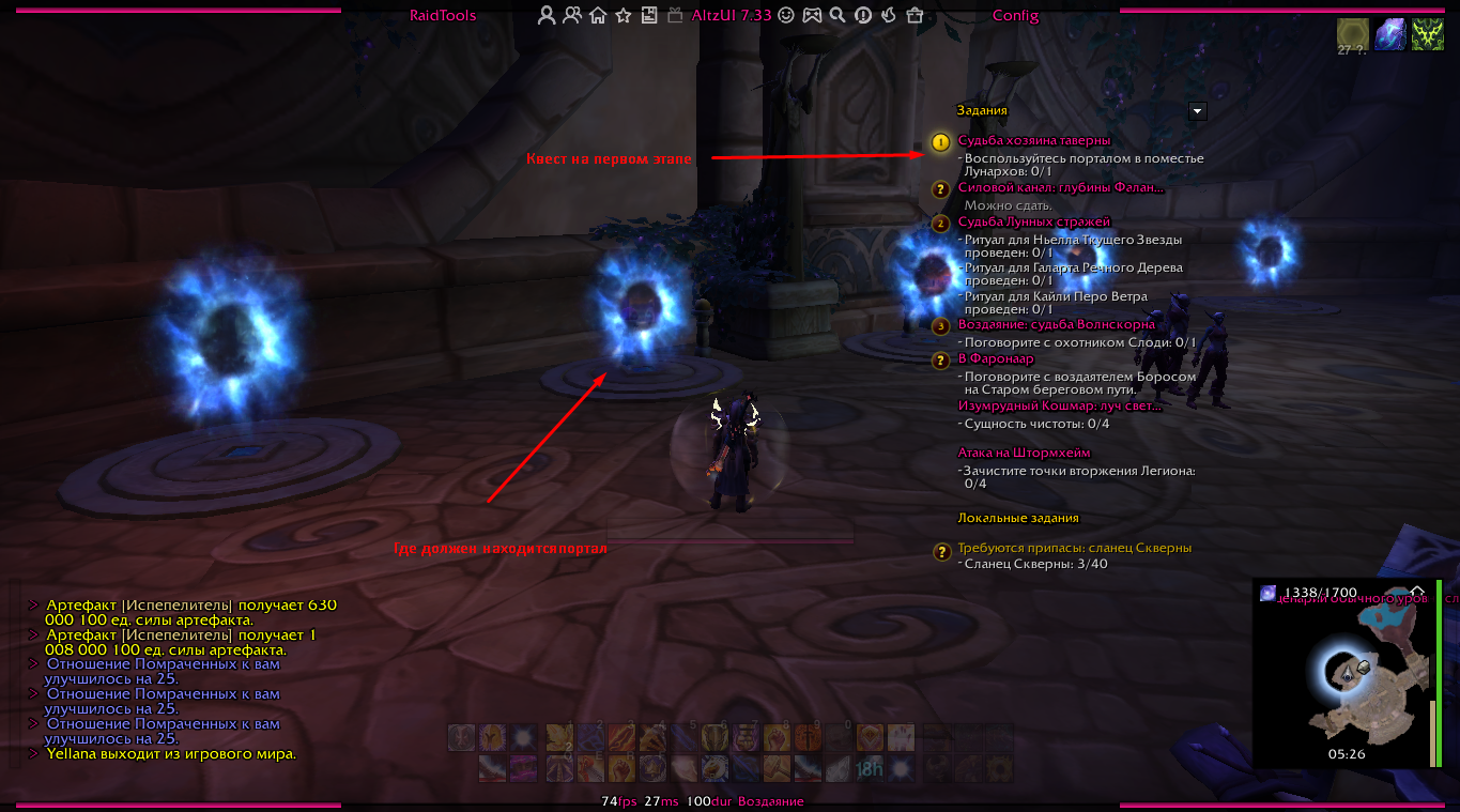 | Description | 1. Ссылка на квест: https://ru.wowhead.com/quest=44742 2. Нет нужного портала для перехода. Название портала: "Портал в поместье Лунархов" 3. Портала нет 4. После взятия квеста, НПС "Первая чародейка талисра" должна отправится вместе с игроком в портал, после должен пройти диалог с тремя НПС, Видео: https://youtu.be/V5fWhfVoRZM | ||||