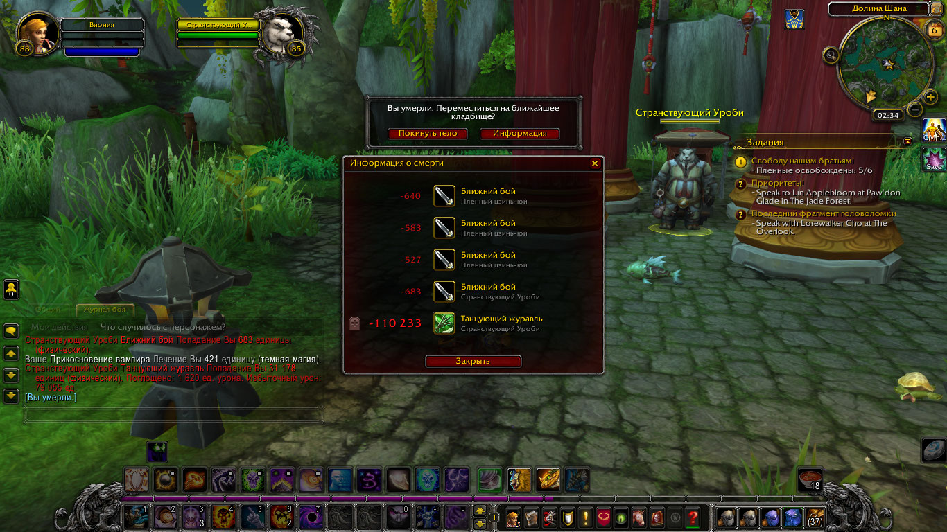 В том то и дело что этот урон в самом начале вертушки и он уже фатальный.Даже 90ого уровня персонаж частично одетый в вещи 380-420ilevel получает не только 110тыс или сколько там было а вплоть до ~130тысяч.И это в первую же секунду как он кастует этих журавлей.Так что я удивляюсь фразе "никакой проблемы" К слову говоря у меня есть лицензия без подписки в данный момент и отлично помню время Катаклизма и Пандарии и вот не помню чтобы моего персонажа этот редкий NPC в первые же секунды боя ложил на землю. Да "Танец журавлей" довольно больно бьёт но не настолько как на вашем сервере. |