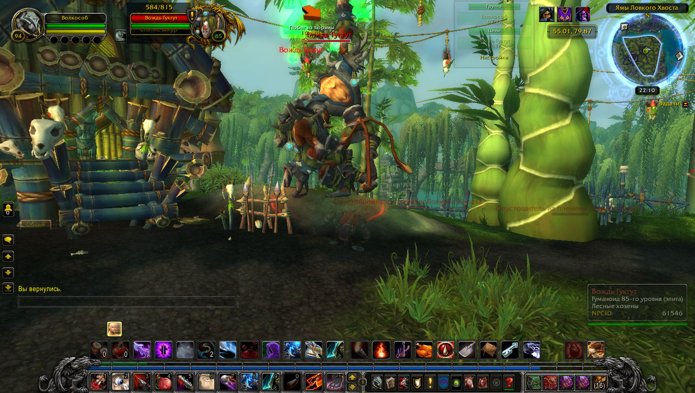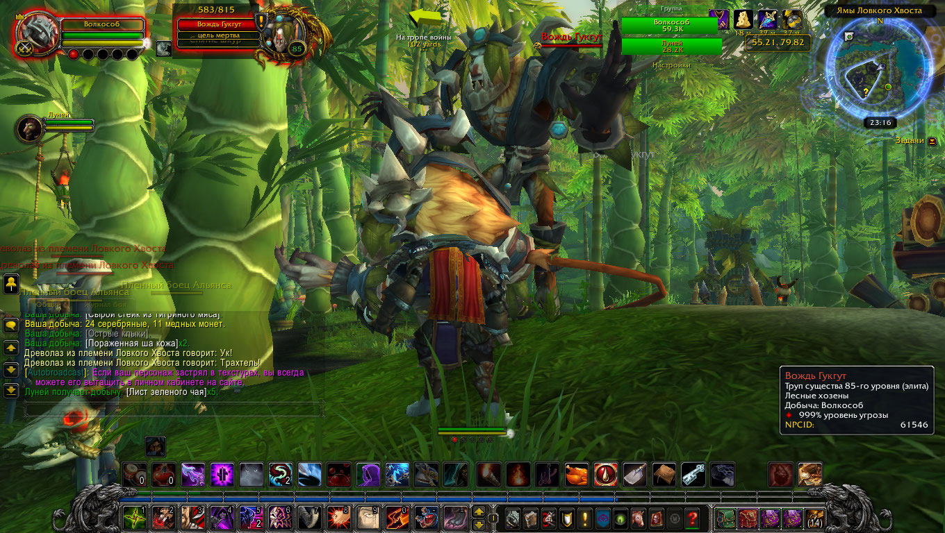 | Description | Прошу проверить квест https://ru.wowhead.com/quest=29906/лови-момент. А именно NPC https://ru.wowhead.com/npc=61546/вождь-гукгут. 1. По базе WowHead ID NPC для квеста 54868, а стоит 61546. 2. NPC стоят по двое, точнее, один якобы висит на ветке, в метре над землёй, второй стоит в том же месте на земле. После убийства того, который стоит на земле - его труп внезапно оказывается в 1-2 метрах над землей. Второго нельзя атаковать в принципе, при том, что визуально он пытается агриться на игрока. Но атаки ближнего боя - "Нельзя применить к этой цели", а дистанционные атаки - "Вне зоны действия". ID у обоих NPC одинаковые. | ||||