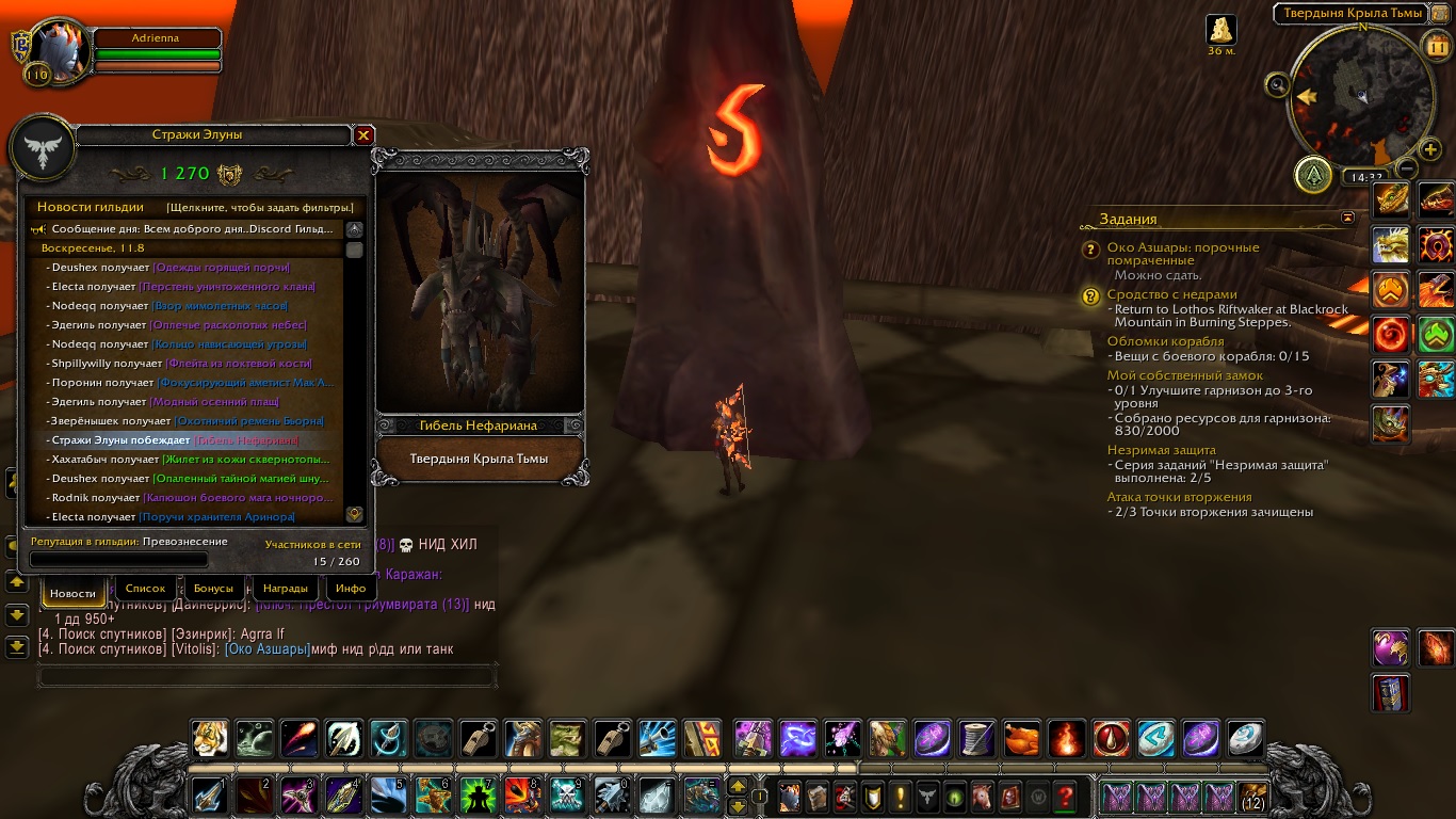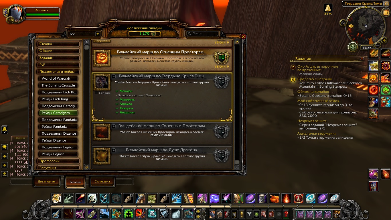 DescriptionМы с согильдийцами собрали группу из трех человек и пошли в Логово Крыла Тьмы, где успешно убили всех боссов. В новостной ленте гильдии было отмечено, что мы в составе гильдии убили Нефариана (последнего босса), но в ачивку гильдии он не засчитался, потому что не засчитывается первый босс рейда. Соответственно, мы не можем добить ачивку Слава рейдеру Cataclism (гильдия), благодаря которой можно купить маунта у гильд торговца.