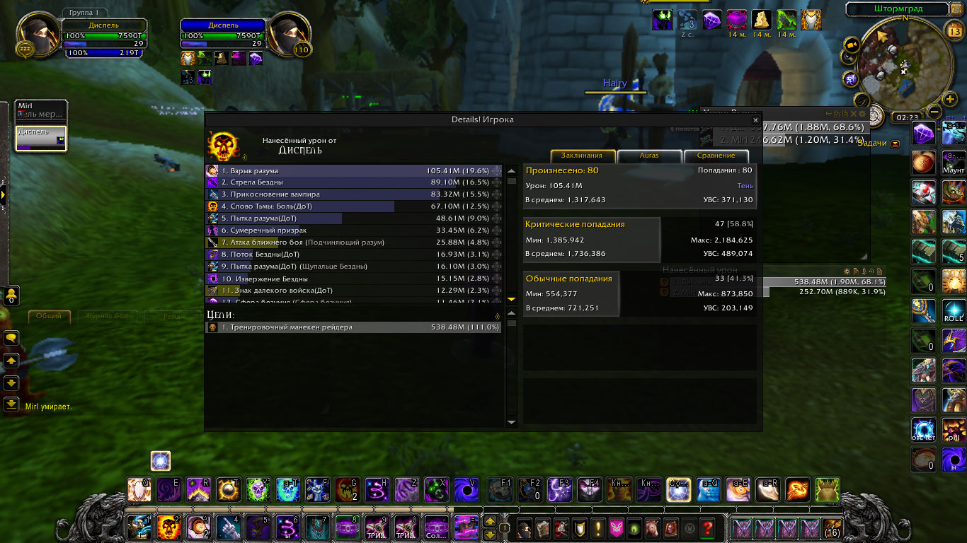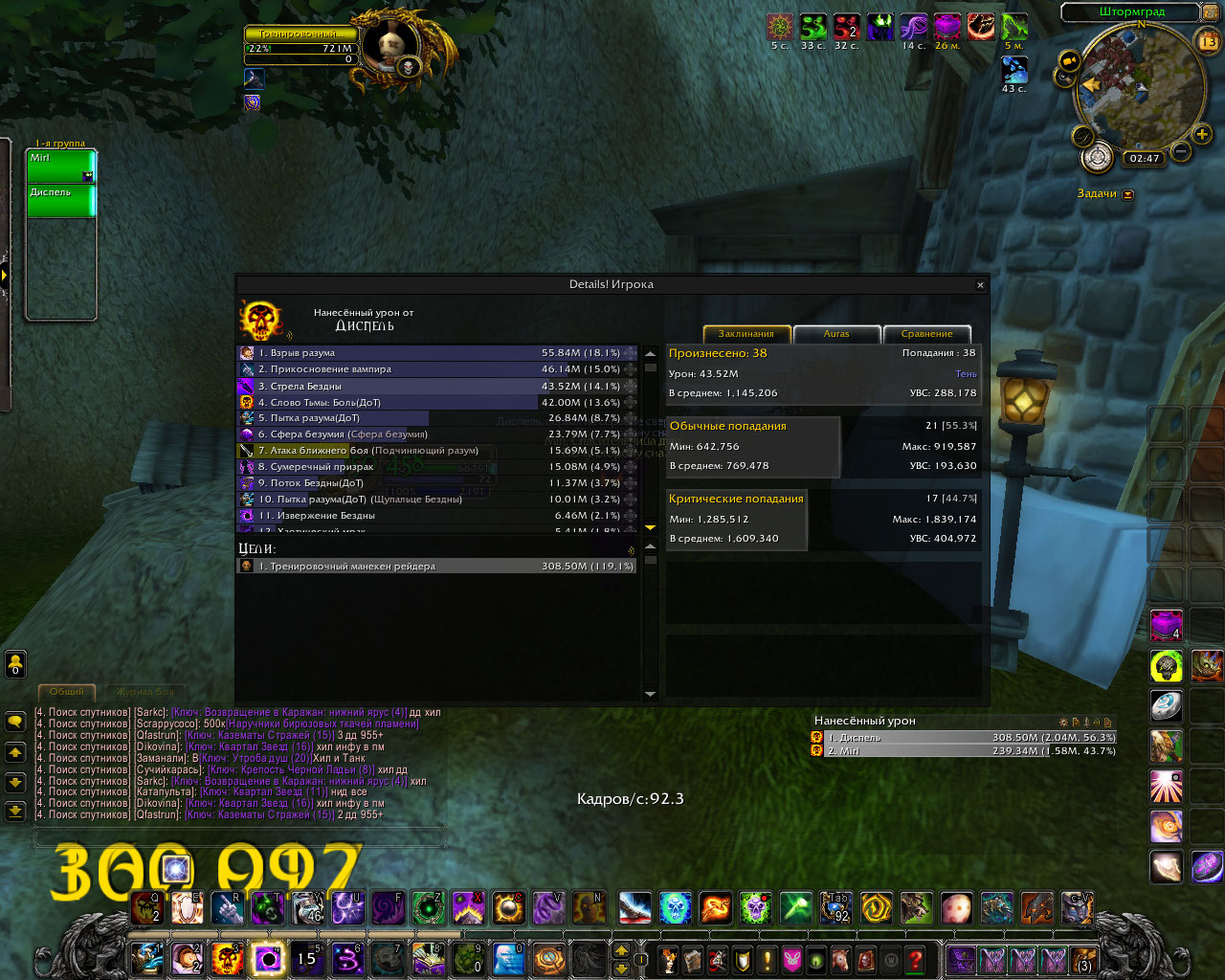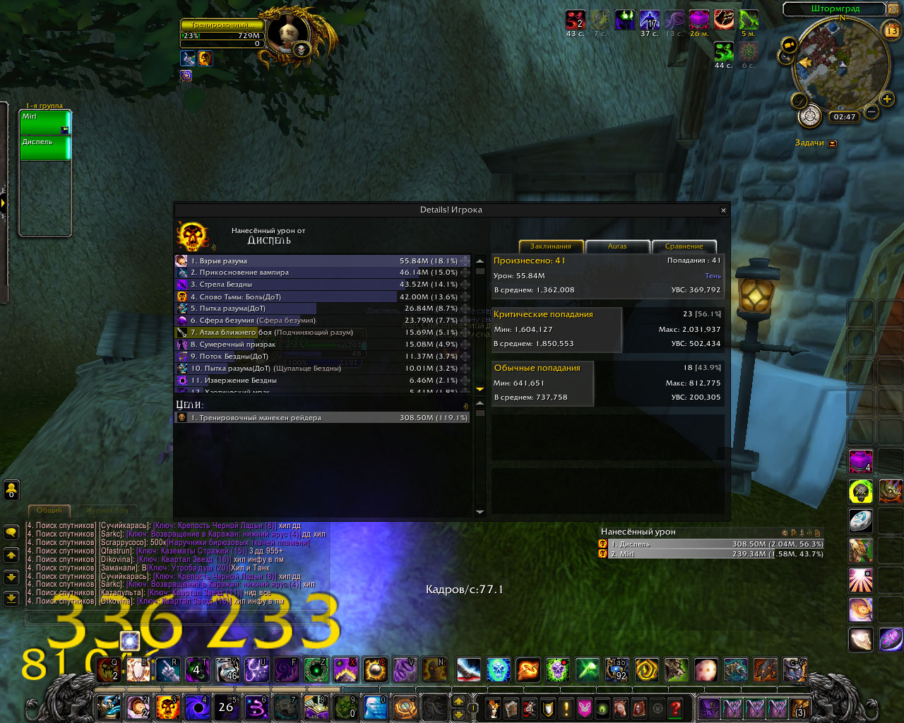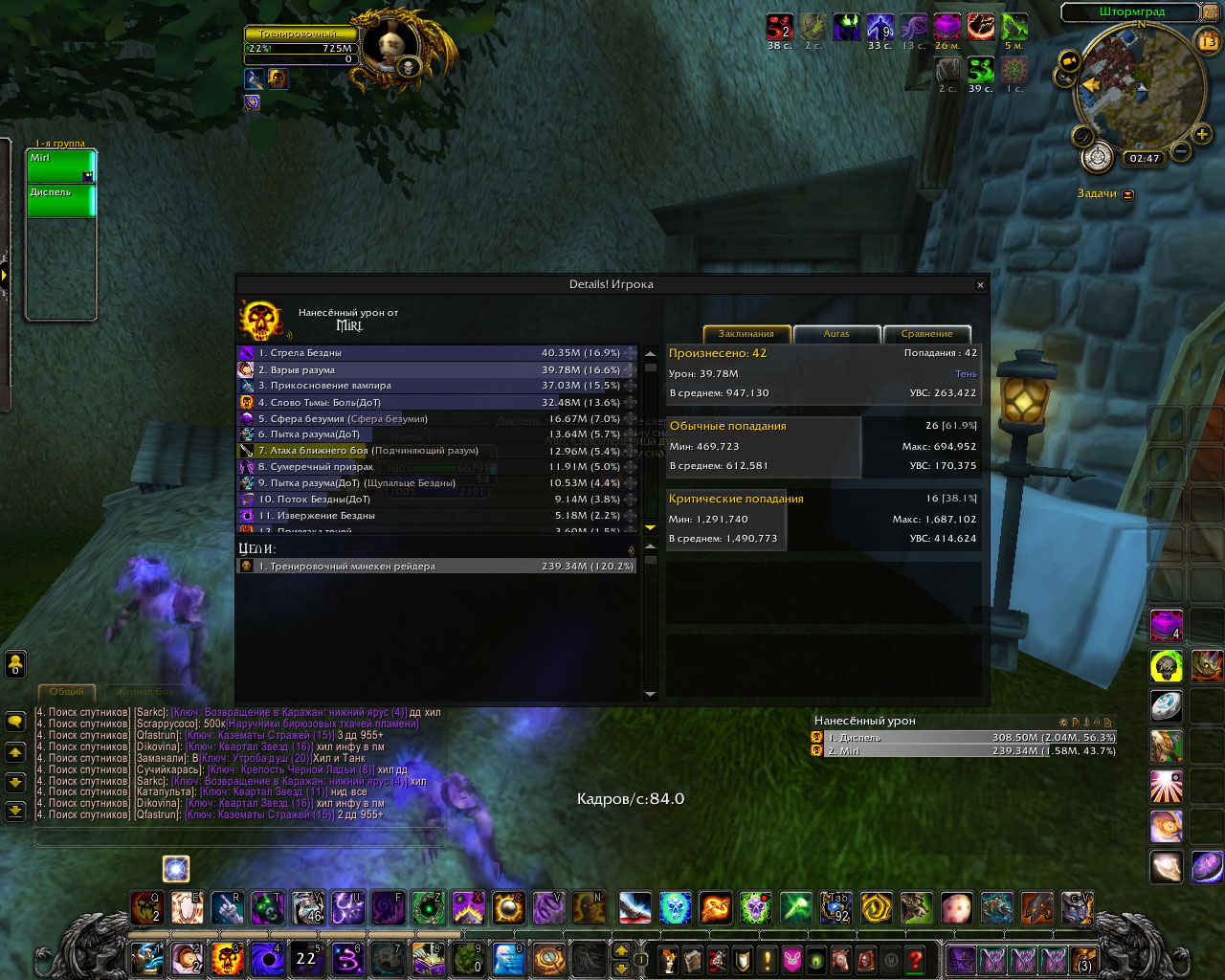 DescriptionПолный комплект делает основным уроном шп криты в длительном бою по логам у шп в абсолютно таком же гире а то и хуже и с такими же реликами и тигелем средний шанс крита 70-80% у способностей которые усиляются комплектом. в моем же случаи это максимум 60% а за частую и 45%. Для проверки я сравнил урон у шп с такими же статами но без комплекта и у него было больше критов чем у меня, хотя это не возможно.Было сделано несколько замеров дпса, просто в одинаковых вещях и вещях который использовались в логах, урона было нанесено столько же сколько за битву с боссом. Первые 6 скриншота просто сравнение одинаковых жрецов с комплектом и без.Диспель тут с полным комплектом. Дальше просто нанесено столько же урона в манекен сколько в босса по логам где шанс крита пытки взрыва и стелы 70% у всех. Из за того что шанс крита меньше , меньше духов, соответственно меньше безумия. На офе жрицы в бисс гире держут 60 стаков не использую питомца а дальше могут все 3 минуты таланта покорение безумию находится живыми на 100 стаках.у нас если после 30 не призвать питомца в гире как по логам то облик спадает через пару секунд. Безумия на много меньше