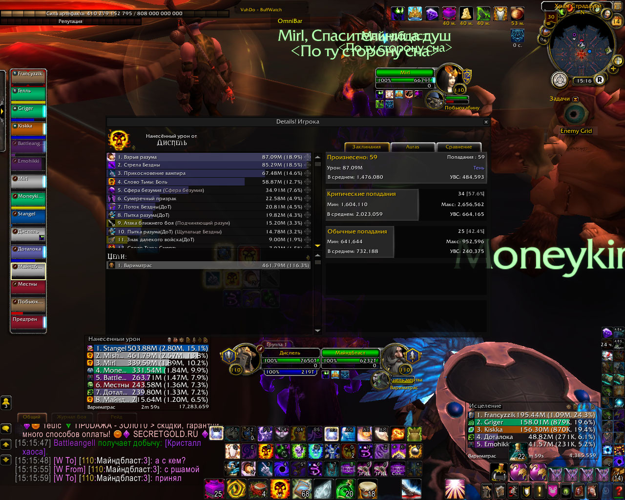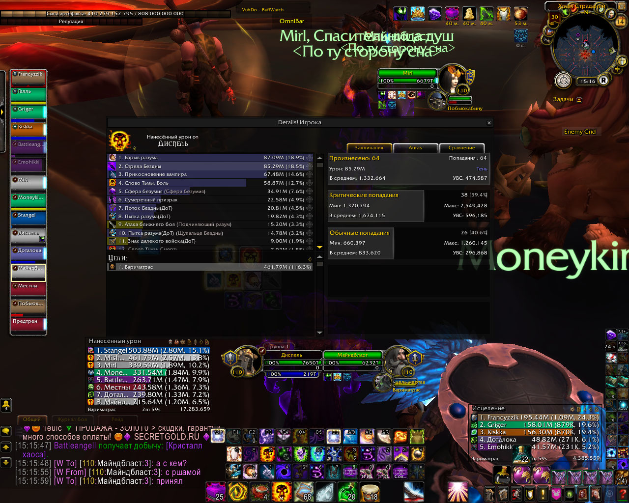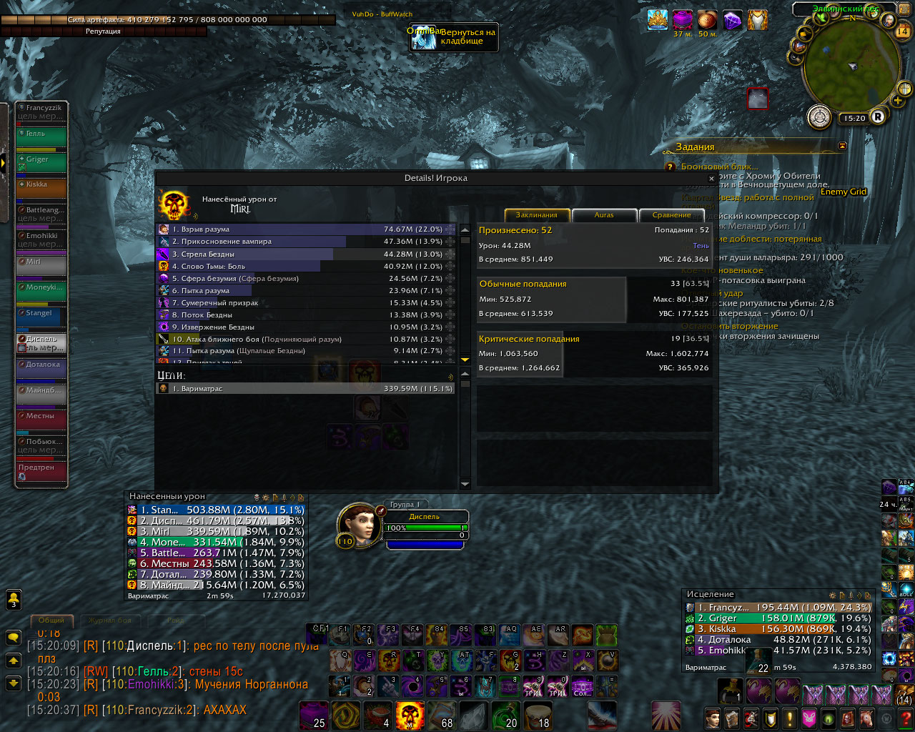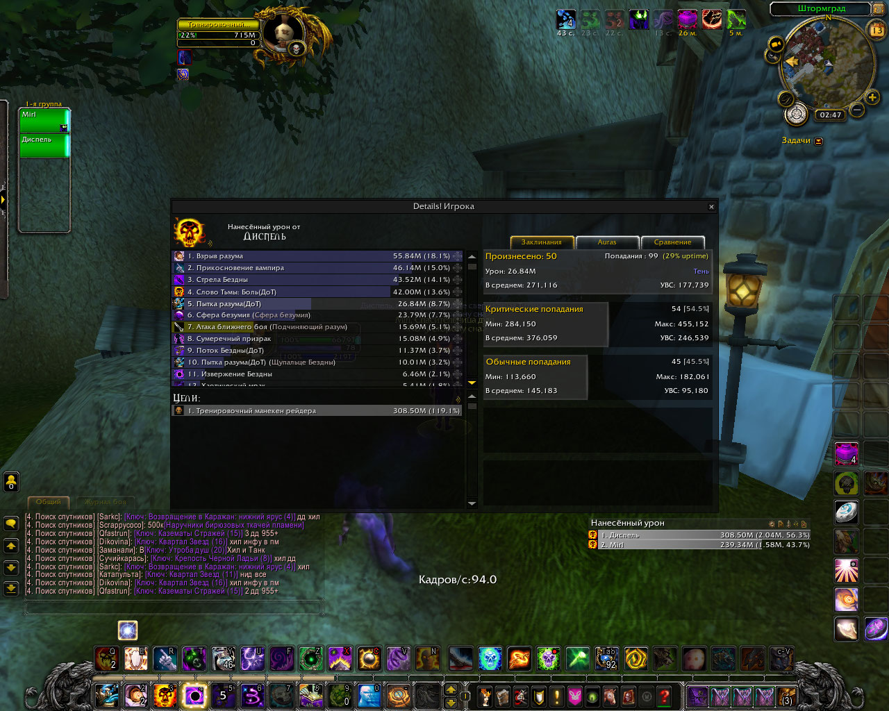 DescriptionПолный комплект делает основным уроном шп криты в длительном бою по логам у шп в абсолютно таком же гире а то и хуже и с такими же реликами и тигелем средний шанс крита 70-80% у способностей которые усиляются комплектом. в моем же случаи это максимум 60% а за частую и 45%. Для проверки я сравнил урон у шп с такими же статами но без комплекта и у него было больше критов чем у меня, хотя это не возможно.Было сделано несколько замеров дпса, просто в одинаковых вещях и вещях который использовались в логах, урона было нанесено столько же сколько за битву с боссом. Первые 6 скриншота просто сравнение одинаковых жрецов с комплектом и без.Диспель тут с полным комплектом. Дальше просто нанесено столько же урона в манекен сколько в босса по логам где шанс крита пытки взрыва и стелы 70% у всех. Из за того что шанс крита меньше , меньше духов, соответственно меньше безумия. На офе жрицы в бисс гире держут 60 стаков не использую питомца а дальше могут все 3 минуты таланта покорение безумию находится живыми на 100 стаках.у нас если после 30 не призвать питомца в гире как по логам то облик спадает через пару секунд. Безумия на много меньше