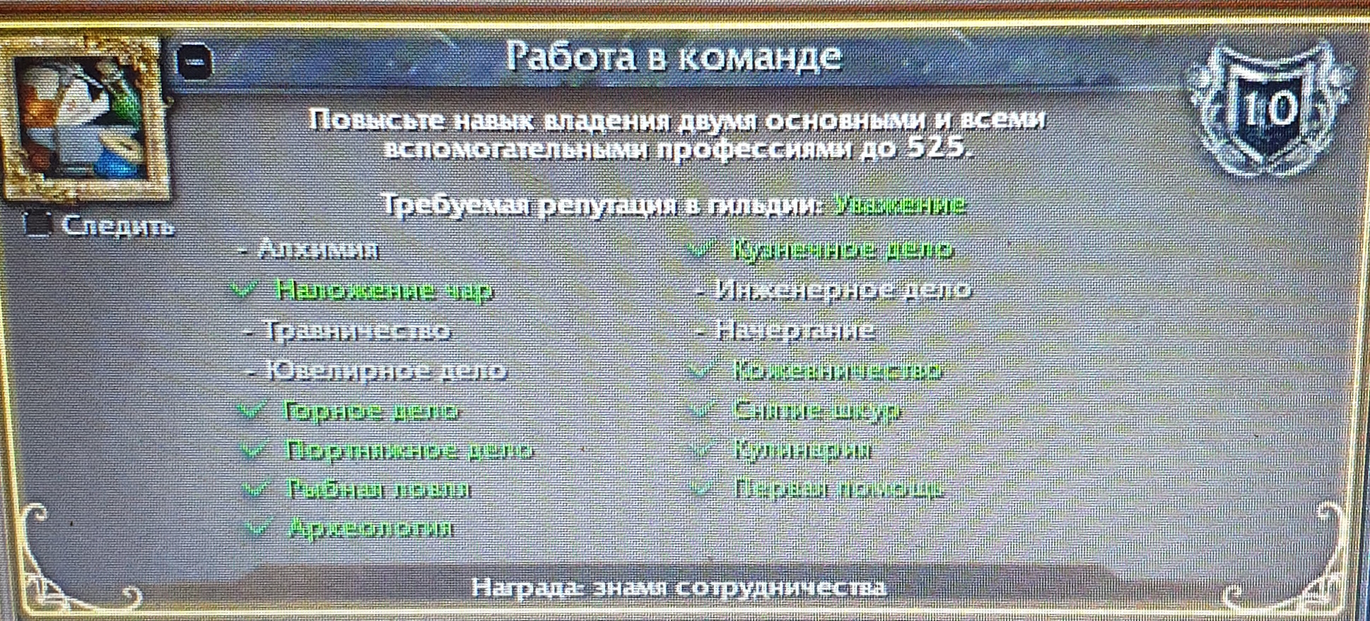 | Description | https://ru.wowhead.com/achievement=4860/%D1%80%D0%B0%D0%B1%D0%BE%D1%82%D0%B0-%D0%B2-%D0%BA%D0%BE%D0%BC%D0%B0%D0%BD%D0%B4%D0%B5#comments работает некорректно. У меня на всех персах прокачены все профы и стоит уважение а ачив не засчитывает, Почему ? | ||||