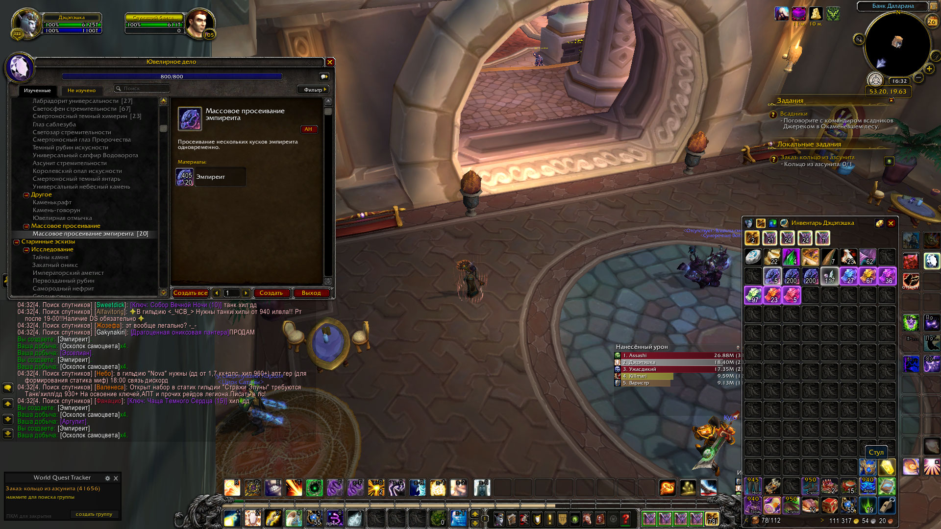 | Description | https://ru.wowhead.com/spell=247761/ Данная способность дает очень малое количество самоцветов. С одного ручного просеивания мы получаем 1 самоцвет и 3-4 камня. С массового (где мы тратим 20 эмперита) мы получаем 4 самоцвета и 0-1 самоцвет. На скриншоте в чате отображаются 4 просеивания. (Делал больше, но не скринил раньше, ибо думал релог поможет) Прошу проверить лут с данной способности. Возможно данная проблема имеется со всеми массовыми просеиваниями, но у меня не дропнулись эти рецепты с 3-4к руды, потому проверить не могу. | ||||