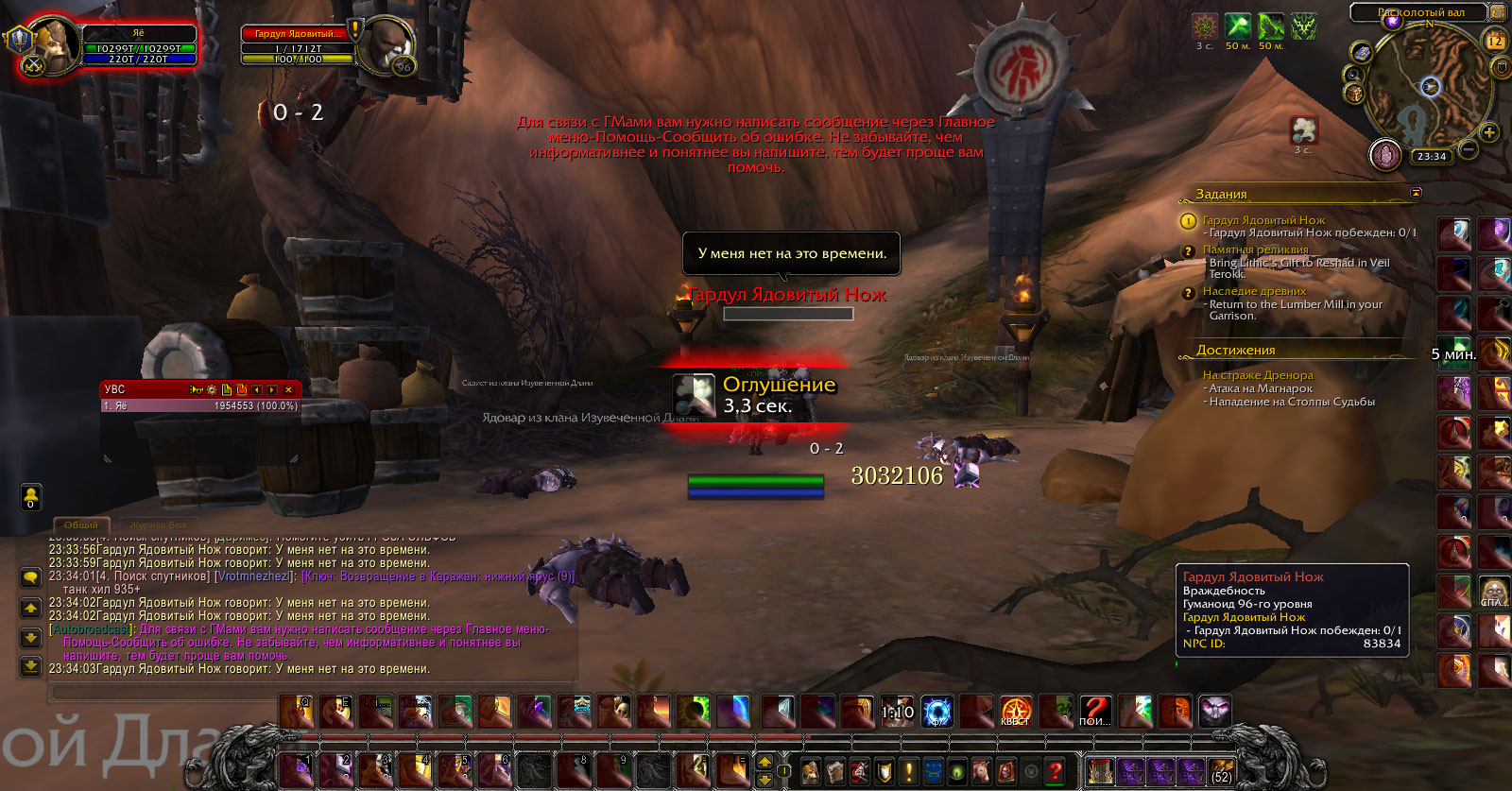 | Description | https://ru.wowhead.com/quest=36029/ Квест для последнего критерия в Араке (Дренор) нельзя выполнить. НИП https://ru.wowhead.com/npc=83834/ , которого нужно побить для квеста, должен быть с 30% хп в начале боя, он же стоит с 1%, запускает нужный диалог, для продолжения квеста, однако тут же тормозит и всё на том. На вовхеде есть видео с проходденим данного задания. | ||||