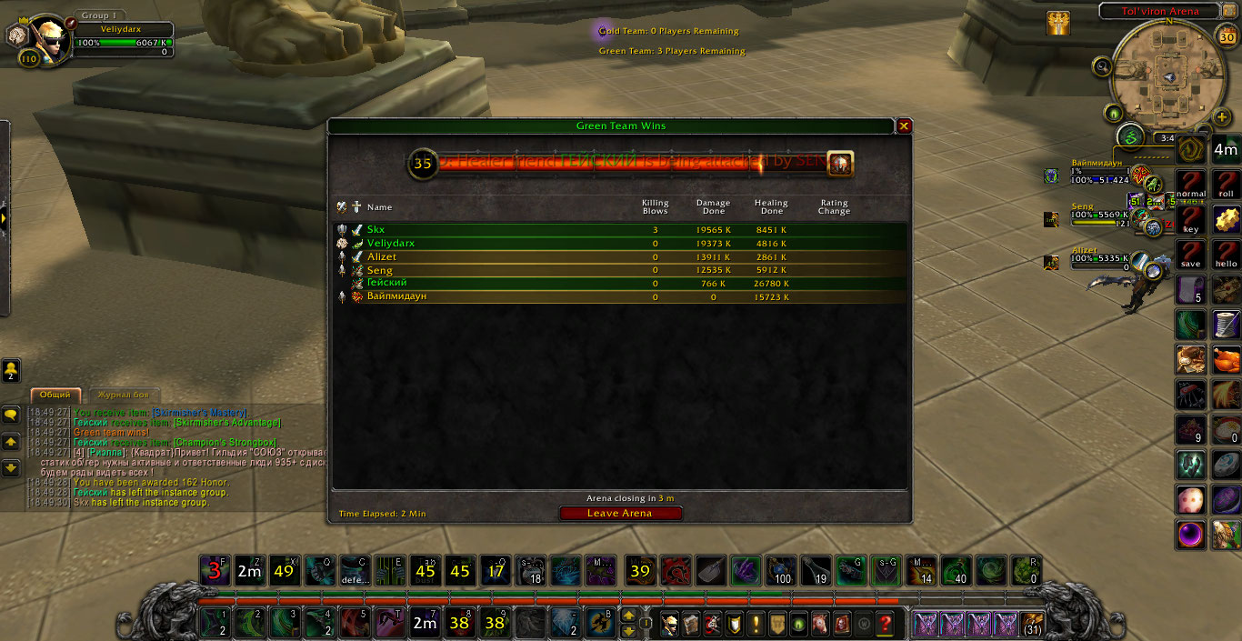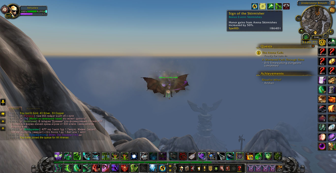| Description | Проблема в том что баф https://ru.wowhead.com/spell=186401 на увеличение получаемого хонора за сыграную стычку при заходе на арену спадает, и хонор начисляется по дефолту 160 (за первую победу в день) и 80 (за остальные) Вместо 160*1,5=240 (за первую) и 80*1,5=120 (за остальные) Собсно на скринах все видно, на арене бафа нет, и увеличения получаемого хонора нет, чем теряется весь смысл от недельного бафа. | ||||