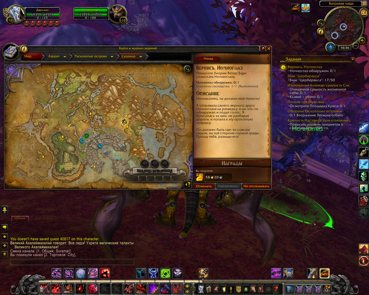 Здравствуйте! Тут проблема не в итеме, а в том что критерий квеста "Ночноглаз обнаружен" не засчитывается Должен засчитываться при убийстве моба https://ru.wowhead.com/npc=100780 или если проходишь рядом с мобом https://ru.wowhead.com/npc=100777 Назначил на разработчика |