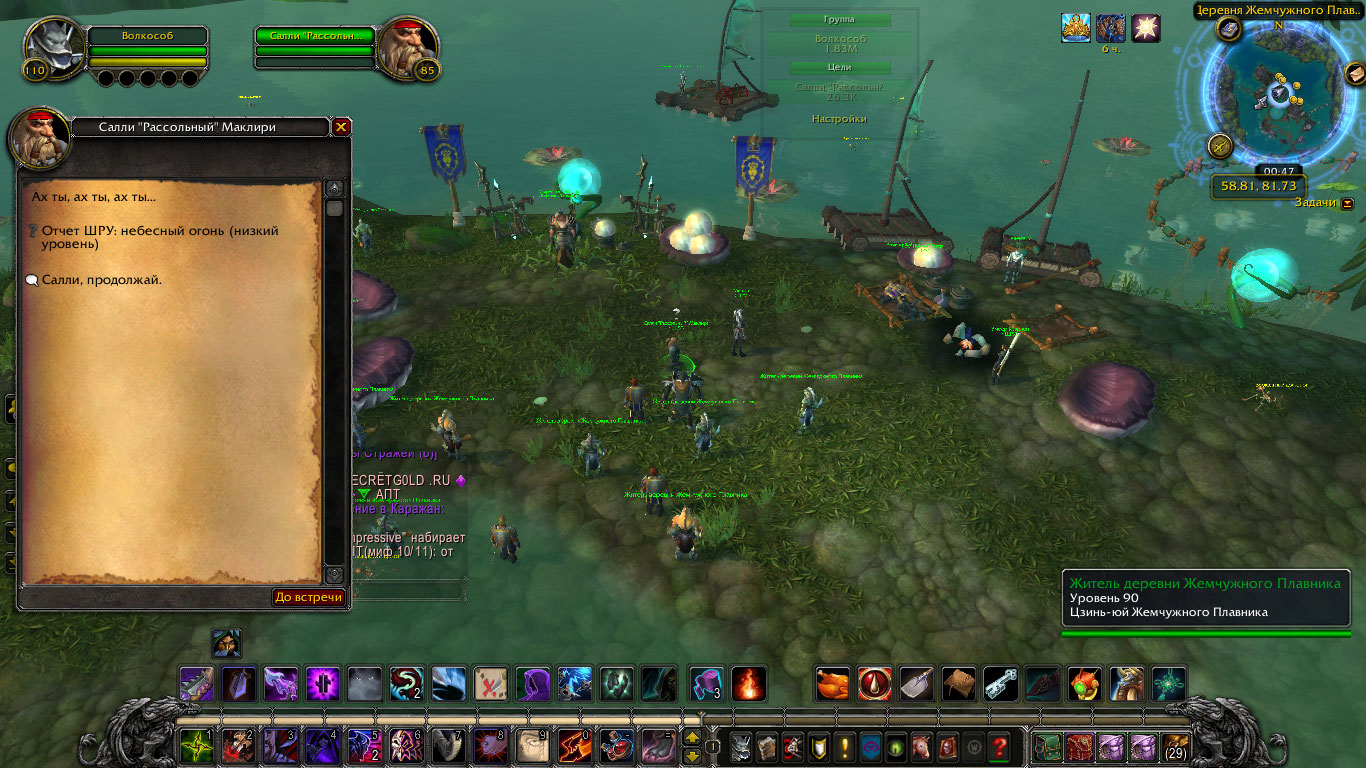 У меня сложная ситуация, NPC https://ru.wowhead.com/npc=55282/салли-рассольный-маклири стоит в деревне жемчужного плавника, даёт квест, при взаимодействии с NPC есть выбор "Салли, продолжай", но ничего не происходит, квест не засчитывается, сдать нельзя.
