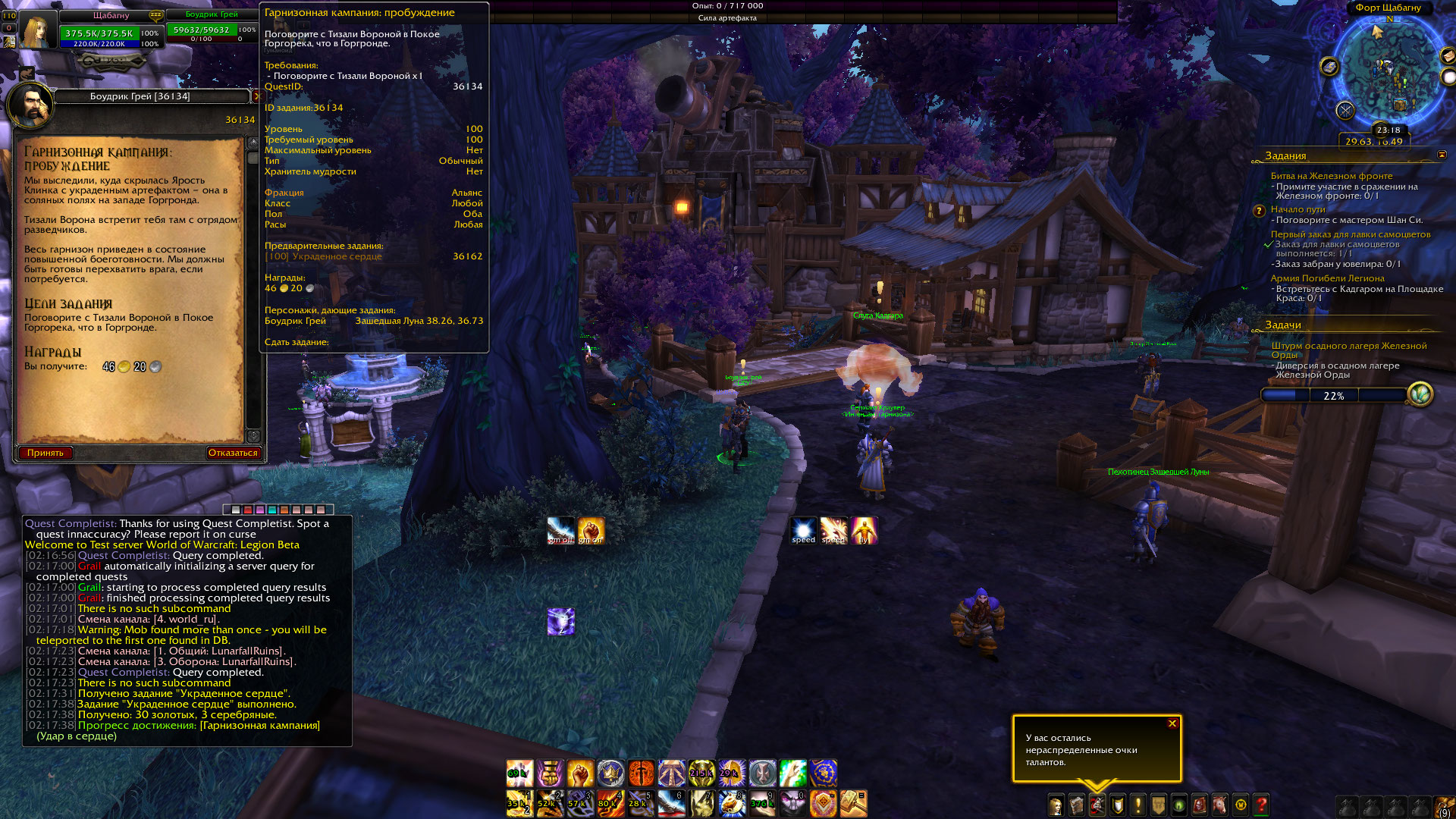 Здравствуйте. У NPC https://ru.wowhead.com/npc=81492/боудрик-грей отсутствует квест https://ru.wowhead.com/quest=36134/гарнизонная-кампания-пробуждение на всех уровнях гарнизона, передаю разработчику |