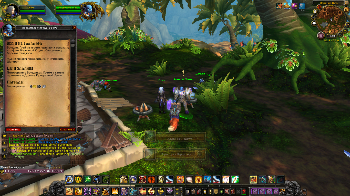 Правильно начать Таладор со строительства гарнизона. Последовательно завершить сюжетку Призрачной Луны, Горгронда, затем в конце сюжетки Горгронда получить пору квестов - возврашение в гарнизон и полет оттуда в Таладор - к началу сюжетки. Но нужно учитывать такой момент - Горгронд 92+, Таладор 94+, Пики Арака 96+ и Награнд 98+. И достигнув указанного лвла можно попытаться обмануть судьбу, подхватив в гарнизоне или в соответствующем аванпосте предыдущей локации одно из заданий: https://ru.wowhead.com/quest=49564/%D0%B2%D0%BE%D0%B7%D0%B7%D0%B2%D0%B0%D0%BD%D0%B8%D0%B5-%D0%BA-%D0%B3%D0%B5%D1%80%D0%BE%D1%8F%D0%BC-%D0%B3%D0%BE%D1%80%D0%B3%D1%80%D0%BE%D0%BD%D0%B4 https://ru.wowhead.com/quest=49565/%D0%B2%D0%BE%D0%B7%D0%B7%D0%B2%D0%B0%D0%BD%D0%B8%D0%B5-%D0%BA-%D0%B3%D0%B5%D1%80%D0%BE%D1%8F%D0%BC-%D1%82%D0%B0%D0%BB%D0%B0%D0%B4%D0%BE%D1%80 https://ru.wowhead.com/quest=49566/%D0%B2%D0%BE%D0%B7%D0%B7%D0%B2%D0%B0%D0%BD%D0%B8%D0%B5-%D0%BA-%D0%B3%D0%B5%D1%80%D0%BE%D1%8F%D0%BC-%D0%BF%D0%B8%D0%BA%D0%B8-%D0%B0%D1%80%D0%B0%D0%BA%D0%B0 https://ru.wowhead.com/quest=49567/%D0%B2%D0%BE%D0%B7%D0%B7%D0%B2%D0%B0%D0%BD%D0%B8%D0%B5-%D0%BA-%D0%B3%D0%B5%D1%80%D0%BE%D1%8F%D0%BC-%D0%BD%D0%B0%D0%B3%D1%80%D0%B0%D0%BD%D0%B4 Только учтите, что это задания-заглушки, если их сдать, позволяют начать сюжетку в локации, но блокируют выполнение штатных сюжетных квестов, которыми персонажа отправляют в следующую локацию. |