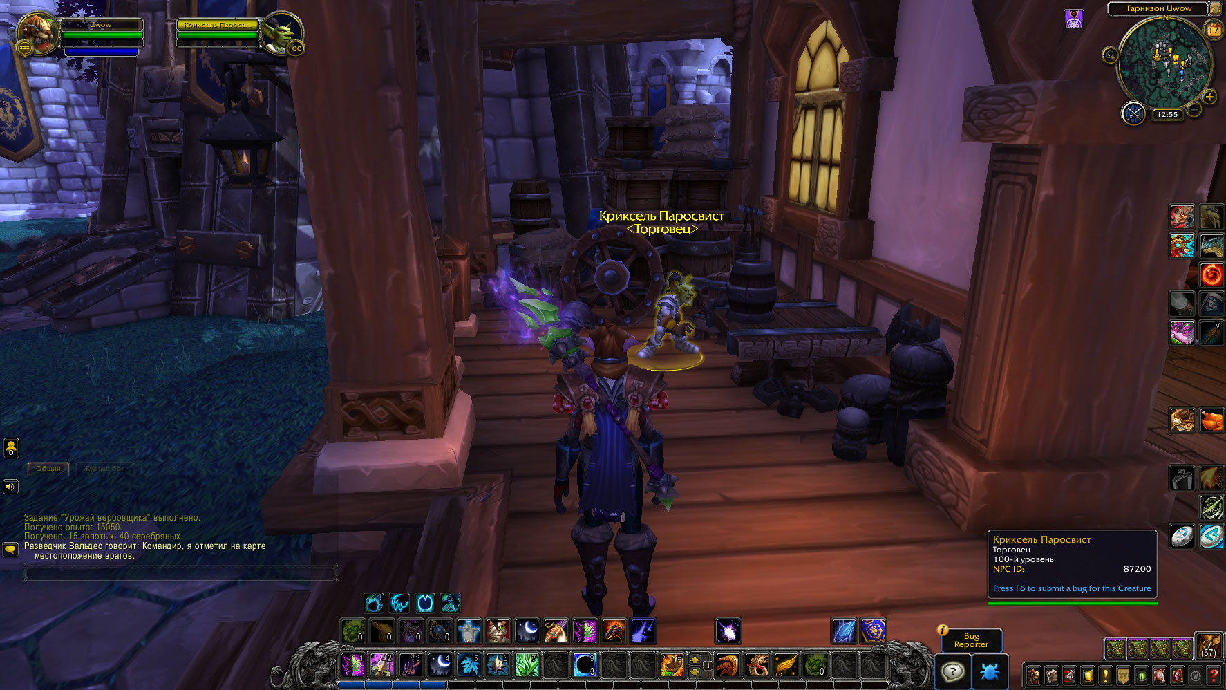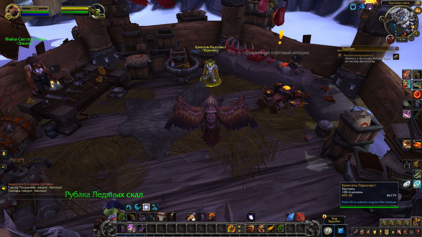 Возможно я неправильно написал id npc, когда проверял баг в торговой лавке 1 уровня, построенной в гарнизоне 3 уровня, поэтому перепроверю ещё раз на всякий случай, чтобы у вас не было вопросов по этому поводу. По указаниям, которые мне дали (а не по моей логике), мне надо делать разные репорты на КВЕСТ, а не на npc. Как будет проще - решает разработчик, а не я. upd. Я не ошибся, и в своём ответе здесь http://tracker.legionbugs.com/view.php?id=7851#c21567 указал npc, на котором квест заработал, а заработал квест на npc https://ru.wowhead.com/npc=86776/реброжор К слову, проверял я уже в торговой лавке 2 уровня, построенной в гарнизоне 3 уровня. А чтобы у вас пропали все сомнения, вот вам скриншот: http://egammi.net/image/Sspw На npc справа на скриншоте квестовый предмет не сработал: http://egammi.net/image/Sspb |