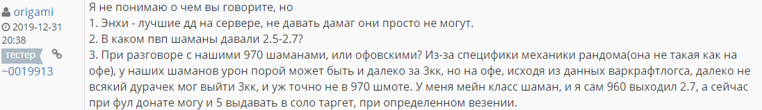 Общение с шп мне ничего не даст, написать можно, что угодно. Теперь по вашему шаману, вам тестер скинул скрин и видео как дамажит в мифик рейде (при рейде, где все дают 2к+) , на счет элемов возможно проблемы есть( опять же вы не указали ни логов, как должно быть и не предъявили доказательства того, что данный класс работает неправильно) Чтобы вашу тему рассматривали подобающе, вам нужно предоставить все выше изложенное. P.S. общение с другими шаманами это не доказательство того, что они работают криво. |