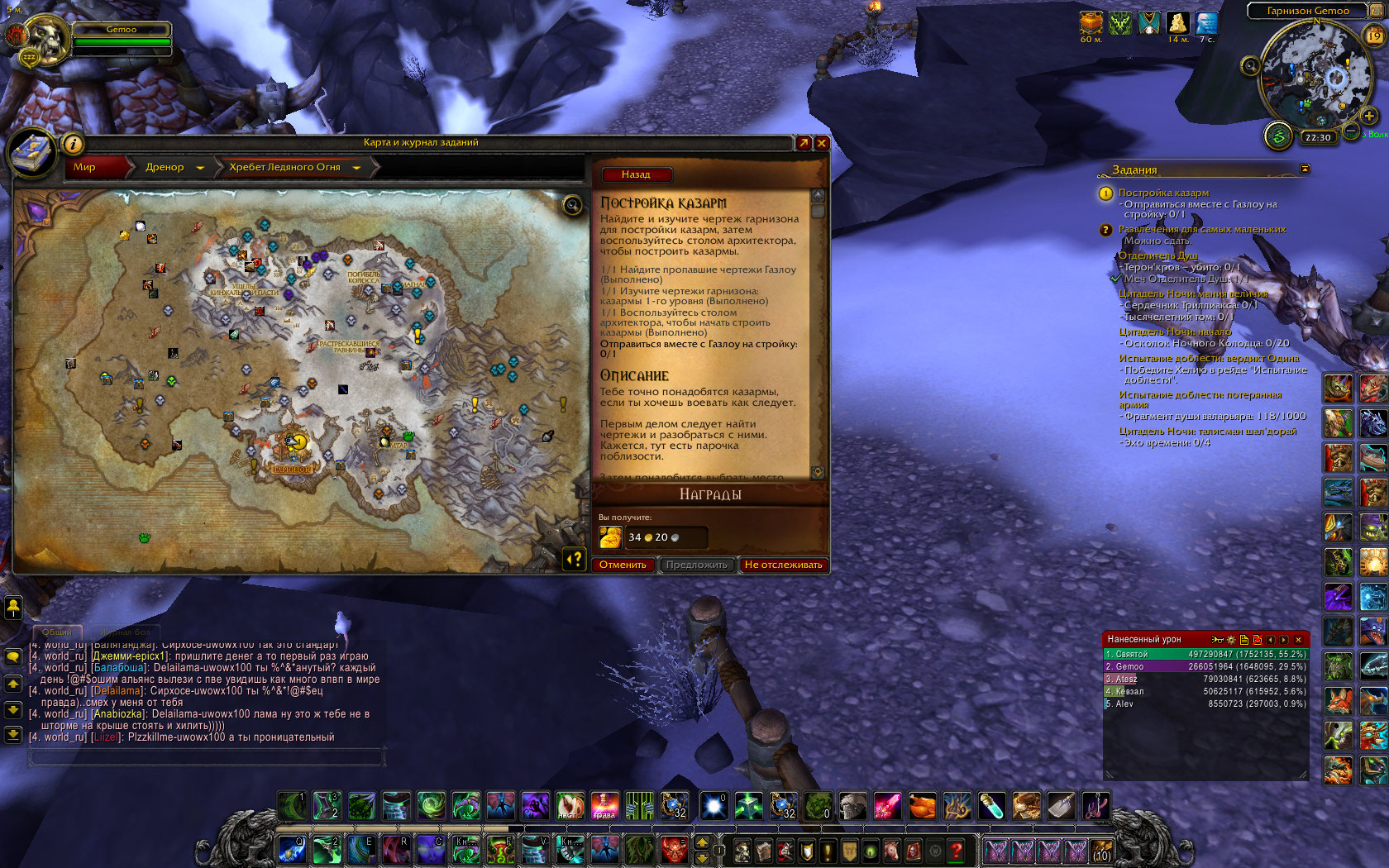 Здравствуйте! Странно что у вас гарнизон 3 уровня, а квест https://ru.wowhead.com/quest=34461/постройка-казарм ещё не выполнен, ведь он обязательный в цепочке квестов на постройку гарнизона 2 уровня, даже когда гарнизон удаляется этот квест тоже нужно пройти. Попробуйте удалить гарнизон с помощью npc О'Ши, которого можно найти, например, в Оргриммаре или в Даларане, и отпишите пожалуйста в эту тему |