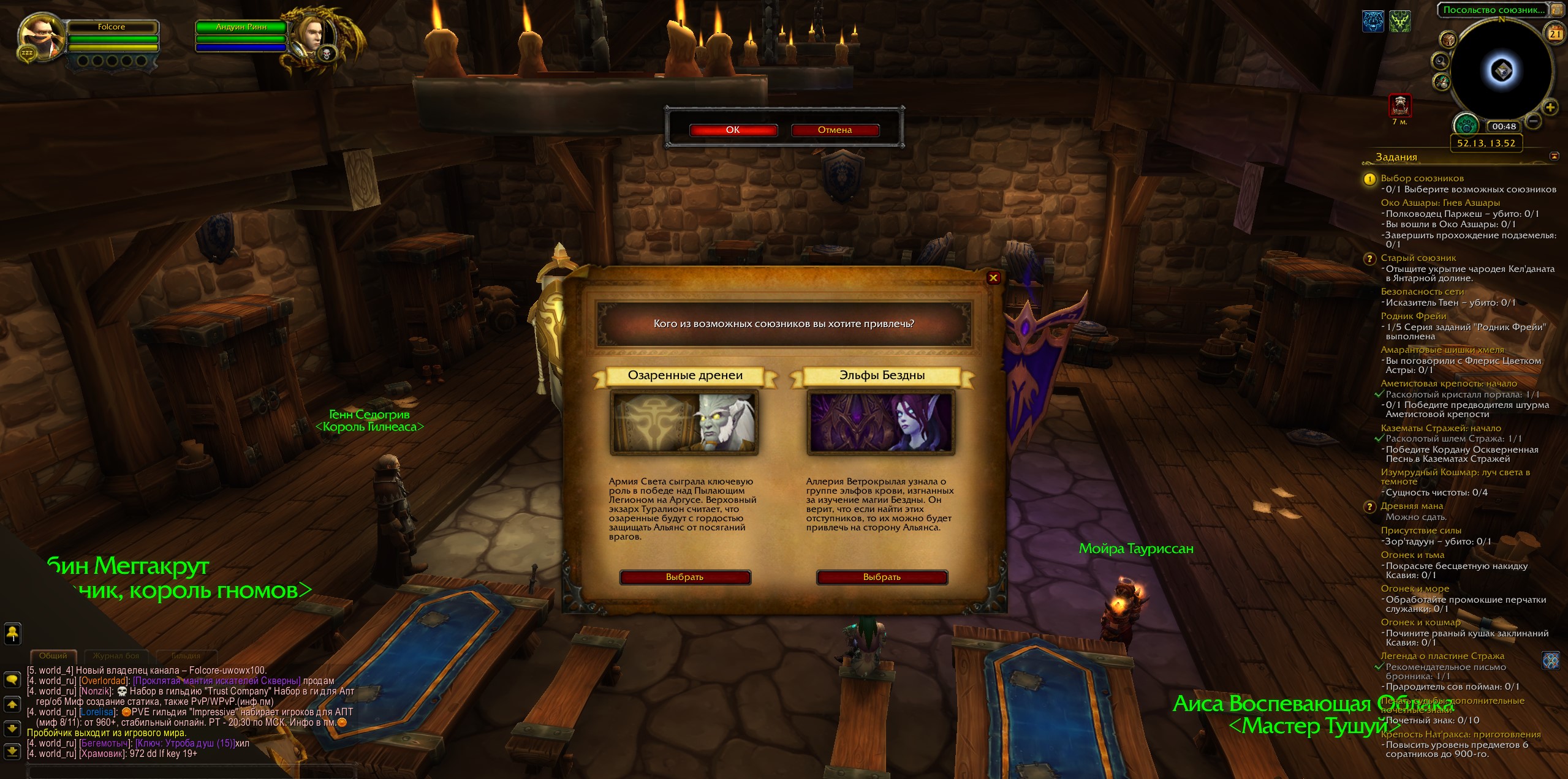 | Steps To Reproduce | Взять квест https://ru.wowhead.com/quest=50239/%D0%B2%D1%8B%D0%B1%D0%BE%D1%80-%D1%81%D0%BE%D1%8E%D0%B7%D0%BD%D0%B8%D0%BA%D0%BE%D0%B2 . Поговорить с Аллерией. Поговорить с Туралионом. Поговорить с Андуином и выбрать союзную расу. Увидеть, что выбор союзника не завершается, соответственно, нельзя и сдать квест. | ||||
