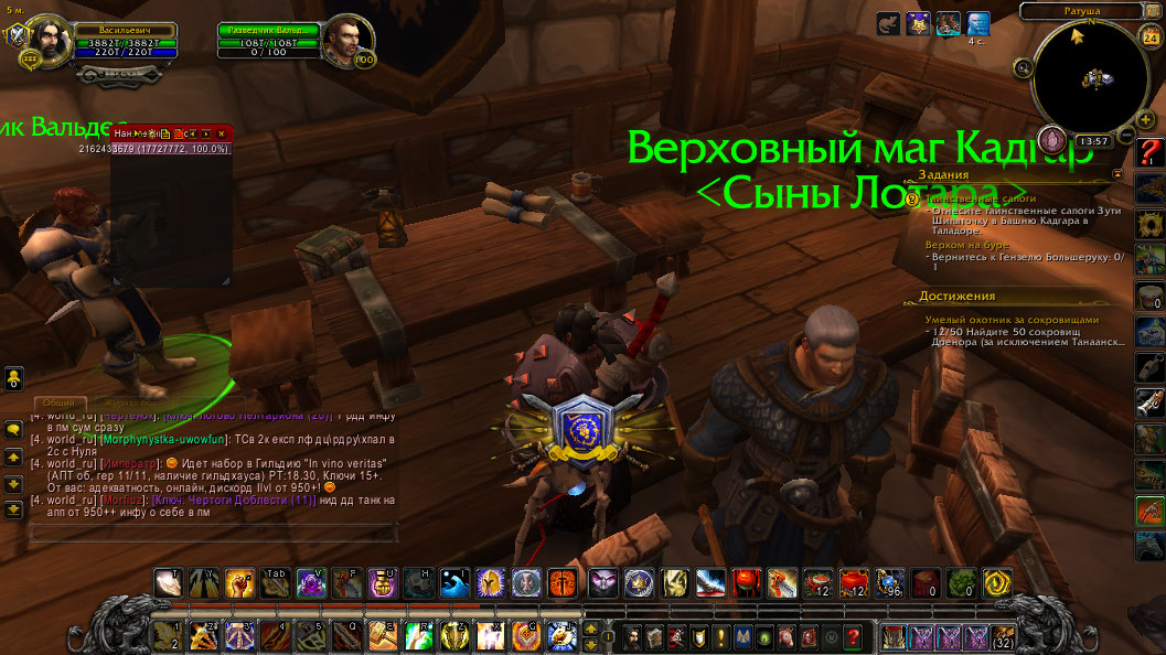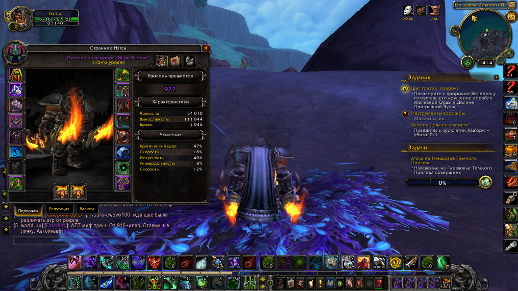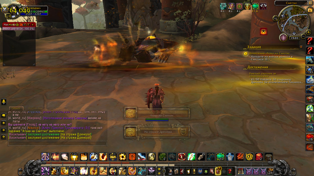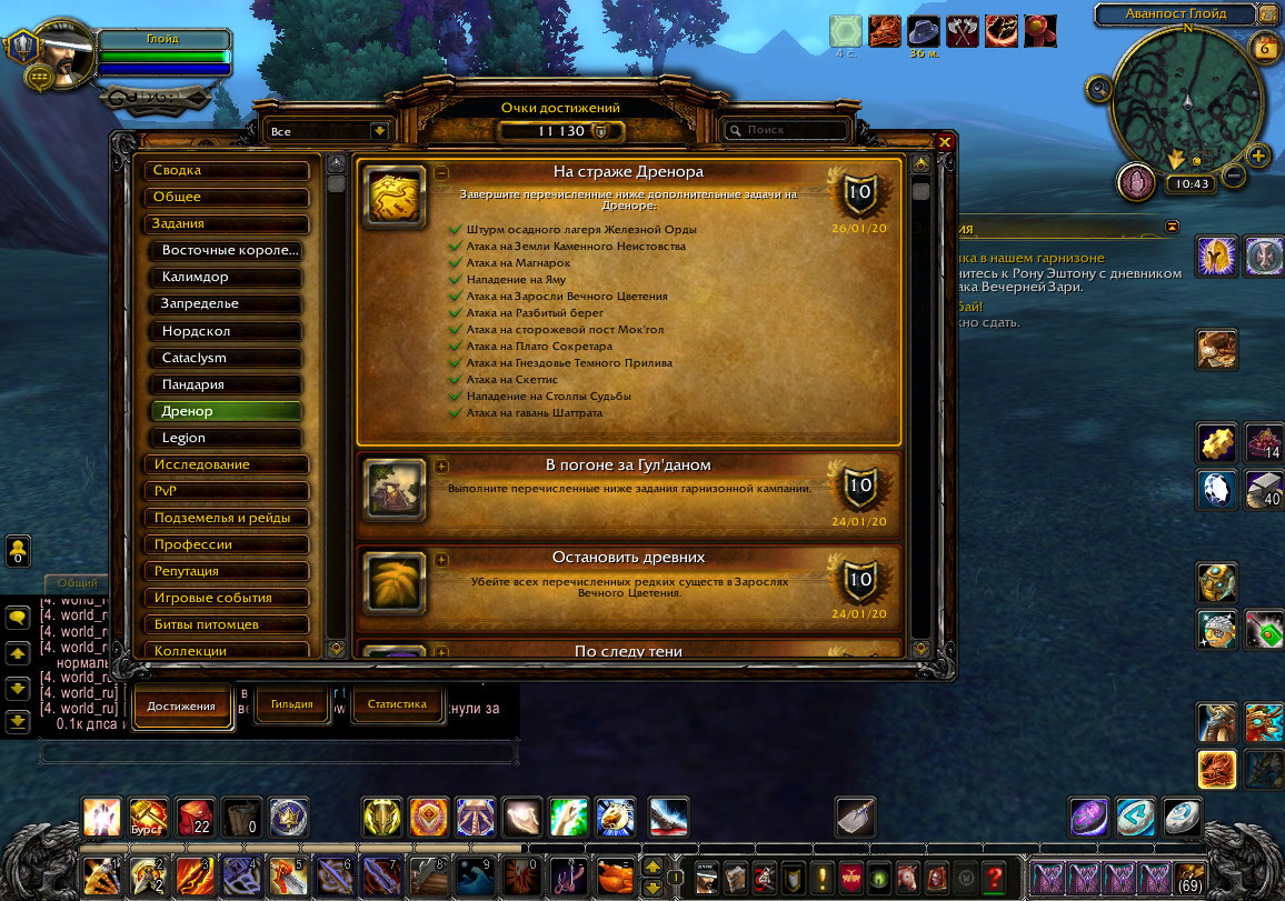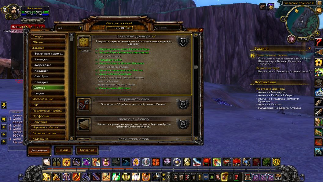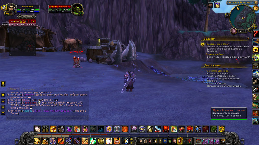 Ачивка получена. От себя хочу сказать пару нюансов: Когда берете Атаку на Гнездовье Темного Прилива - там локалка глючит, она то появляется то пропадает. Если вы РДД-остановитесь на месте, когда она появилась и палите в ближайших мобов для удобства, если в мдд, то бегайте вокруг мобов и старайтесь как только на секунду включается локалка сразу убивать мобов. Когда берете Атаку на Скеттис, поступайте также как написал выше парень tarakan - убивайте рарника, за которого дается по 30%. Все остальное напишу в гайде, когда сделаю ачивку. Спасибо за помощь, одним нюансом стало меньше, надеюсь не придется создавать тему по "Сокровищам Дренора", пока там не работают сундуки с под камней в Горгронде. Ачивка кривая, но получить можно. |