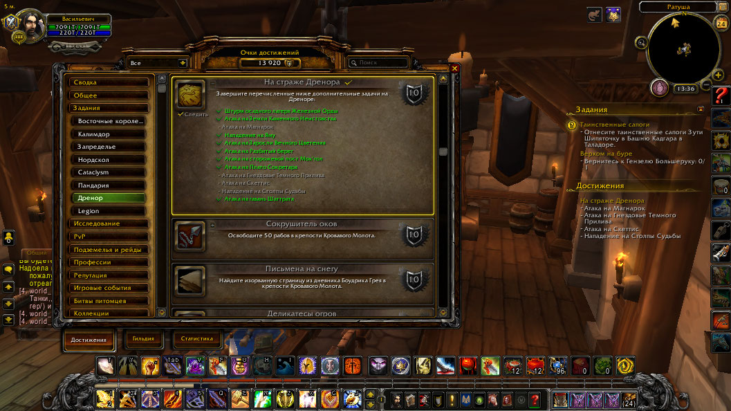 Доброго времени суток. Я снова к вам по тому же вопросу. Долгое время я не желал заниматься кросспостингом, но теперь решил попытать счастья. Создал я значит 4го персонажа для выполнения этой ачивки уже за противоположную фракцию, кстати там поярче гарнизон, как-то попрофитнее работает, чем на Альянсе.(никнейм - Ачивкадренор, как не странно) Я выкачался, прошел цепочки и апнул гарнизон до 2 лвла, чтобы появился хваленый стол с "синими" заданиями для локалок и ... он таки появился! Но вот в чем прикол, когда я хотел взять хоть 1 задание, нажал на синий знак, стол стал нерабочий, вернее карта с него магически исчезла. Я понимаю, что мне можно сказать мол "дренор сырой, он делается и т.п." или можно показать скрин где тестер стоит с рабочими локалками, я в это бы нормально поверил и отреагировал, но вот реально ребята - 4 персонажа и у них одно и тоже, причем 2 из них свежаки, не с патча 7.0.3, тобишь ничего у них забаганого не может быть. Вопрос к тестеру , как получилось так, что у вас вышло взять локалки, а у меня и других ребят не выходит? И еще последний вопрос - раньше, когда оплоты малорабочими были, можно было написать в баг-репорт и тебе помогали засчитывать или выдавали квесты и т.п. Сейчас такое делается? Вы можете еще сказать по поводу НПЦ, которые стоят в столицах и "чинят" ачивки и т.п., но если честно я ниразу еще не смог через них починить ачивку, приходилось просто создавать нового перса и делать на нем ачив повторно. Кто-то сделал этот ачив, когда он был забаганый и балдеет сейчас, скидуя репорты на рыбалку в Дреноре, а мы трудяги-работяги основную ачивку не можем никак сделать. |