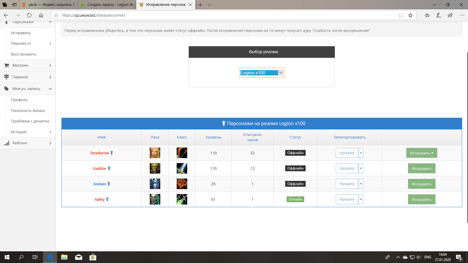 | Description | Вылезает ошибка при входе на разбойника(с другими персами этого аккаунта все нормально),удалил все аддоны,удалял папки кеш и ерор,через лаунчер докачивал файлы в папку с игрой,не помогает,при попытке исправить персонажа в лк выдает статус "Онлайн" хотя меня нет в игре. | ||||