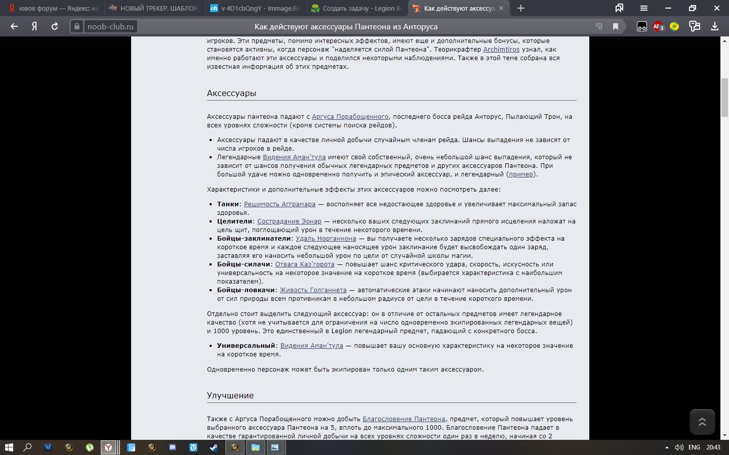 | Description | С последнего босса в АПТ должен упасть акксесуар ( на каждый спек: дд/рдд/танк/хил), мне на мага должна упасть "Удаль Норганона". Шанс ее выпадения большой, я убивал последнего босса раз 18. так и не упала. спрашиваю в ги, всем упала с 1-2 раза. Я считаю что это какой то баг или ошибка в персонаже. Он был создан в 2017, во время 7.0.3 версии, возможно это сыграли какую то роль. Прошу решить мою проблему. У деббагера( в игре) нет этой вещи. Заранее спасибо. | ||||