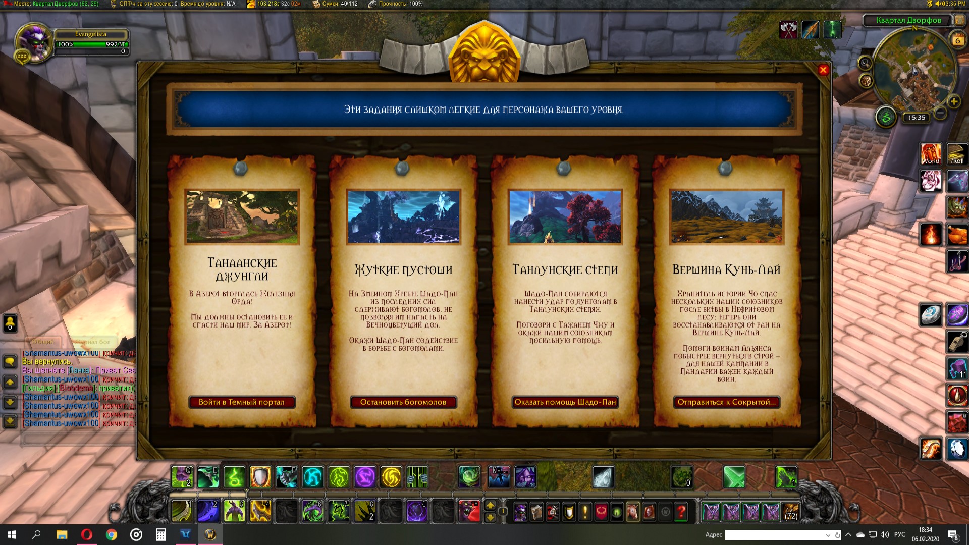 Нашел 6 квестов которые я не сделал. Главный как я понял квест с доски для героев. Но как быть если я его не могу взять? Доска показывает только путь в пандарию, пытался взять все квесты, но лемит заканчивается и не хватает места. Скриншот №3 выше. |