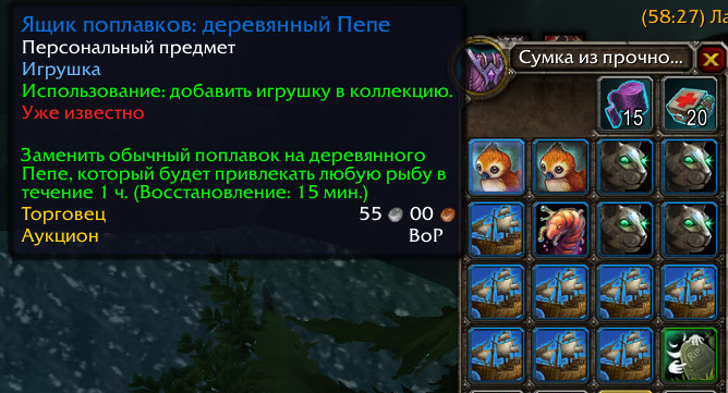 | Description | Проблема этого репорта: http://tracker.legionbugs.com/view.php?id=8327 вылазит боком для всех перечисленных итемов. На их дроп влияют рейты. https://ru.wowhead.com/item=143662/ https://ru.wowhead.com/item=142528/ https://ru.wowhead.com/item=142529/ https://ru.wowhead.com/item=142530/ Почему вылазит боком? - Да я реально уже замахался чистить сумки от этих итемов, до того как начал пилить репорт - удалил из сумки наверное 10 шт. Пепе и прочего. Специально для репорта скрин. Это полный треш, когда эти итемы засирают сумки. Если нужны координаты - допишу. Ибо могу показать места где Вы не полутаете ни 1 игрушки. На скрине аж 15 игрушек. Это нихрена не норма, что за час можно выловить 50+ дублирующихся игрушек. Как вариант - можно поступить по другому, чтобы этот итем нельзя было выловить если он уже изучен. (Но это не близзлайк). Нужно также убирать влияние рейтов на эти итемы. P.S. Все игрули рабочие, поплавки видоизменяются. | ||||
