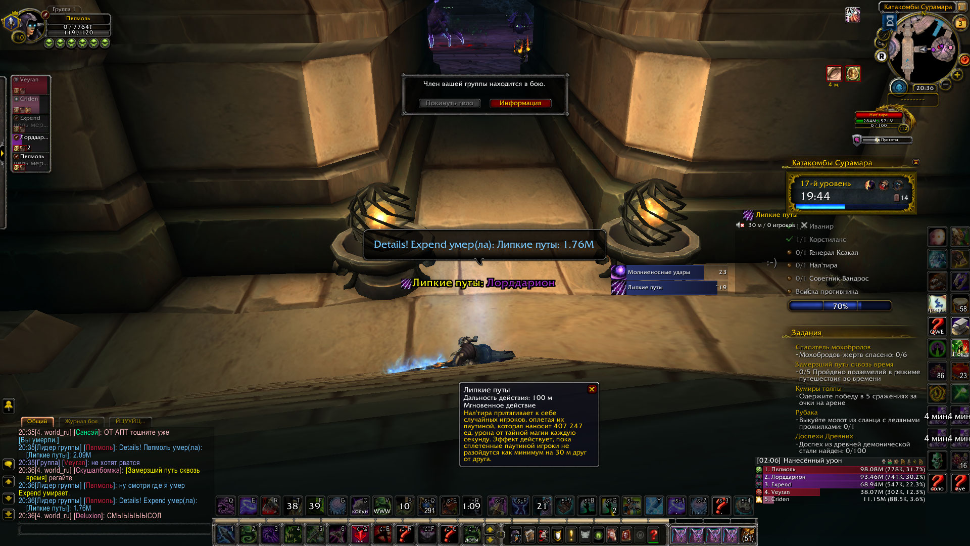 | Description | Вот эта штуковина https://ru.wowhead.com/spell=200284 ПОСТОЯННО багается. Очень часто бывает такое что путы уже спали, а дебаф вешается НАВСЕГДА. То есть цель просто умрет в 100 % случаев, т.к. прохилить это нереально. У нас сегодня это настолько часто багалось, что мы специально остановились, я включил OBS и заснял на видео. Что будет на видео? 1-й момент - все окей. 2-й момент - тоже. 3-й момент - мы порвали путы, это видно что они пропали, дебаф на мне остается, я умираю. Затем второй дк тоже умирает, т.к. на нем дебаф тоже остался. Видео: https://youtu.be/j6qu8gNqs0Y Нужно переписывать корректно все это дело. У меня вообще сложилось мнение что это все багается из-за каких-то бопов, фридумов. Просто на первых траях мне пал дал боп сразу же, я еще не не порвал путы, - после порвал и дебаф остался. Мб никак не связано, ибо на конкретно записанном видео пал этого не делал. | ||||