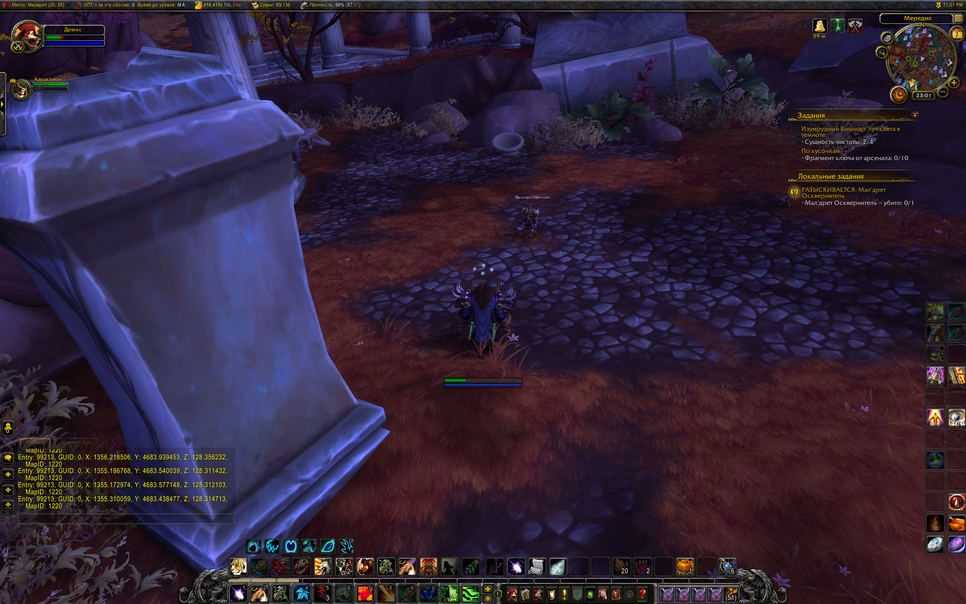 На скрине попытка друидом помочь другу ДХ пройти этот квест. На дру квеста не было, на ДХ был. НПЦ нет так как он видимо был убит перед нашим приходом. Но Тем не менее, урон и стан наносились обоим персонажам. Когти друида как ни странно, урона никому не наносили, а ДХ сумел убить 99213 (я видел это в полной версии лога), но в квест ему это не засчиталось. скрипт указывает на https://ru.wowhead.com/npc=99213/%D1%8D%D1%80%D0%B0%D0%B7%D0%BC-%D0%BB%D1%83%D0%BD%D0%BD%D1%8B%D0%B9-%D0%BA%D0%BB%D0%B8%D0%BD%D0%BE%D0%BA невидимые копии - почему копии - когда на ДХ делал этот квест и убивал 99213 , то только видимых копий НПЦ было три, плюс две, которые не было видно , но которые последовательно были убиты массовками ДХ. Урон наносился 99213, и соответственно первая строчка агролиста на нем, а вот стан накидывался чем то вроде "какойтотам иссохший", также невидимыми как для моего чара так и для друга. А то, что почему то входящий урон и соответственно, от кого он поступает не показывается в логах я тоже заметил. |