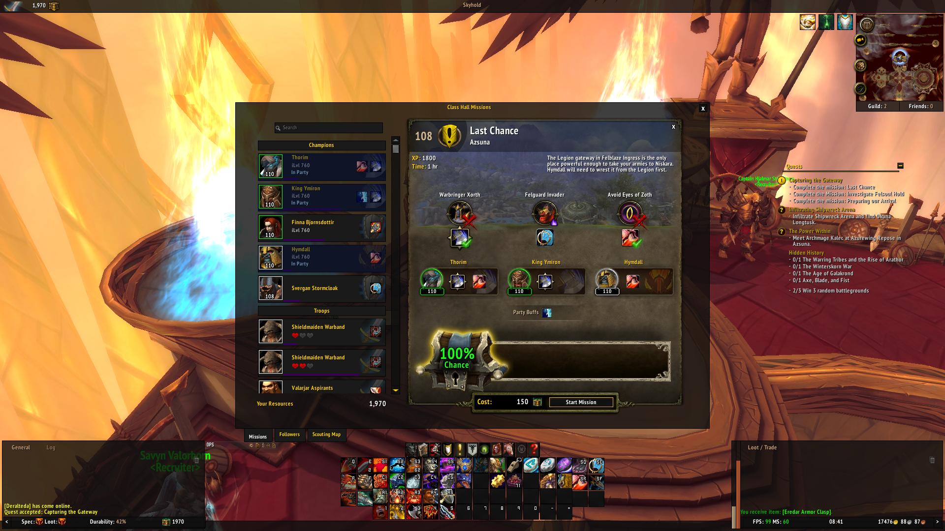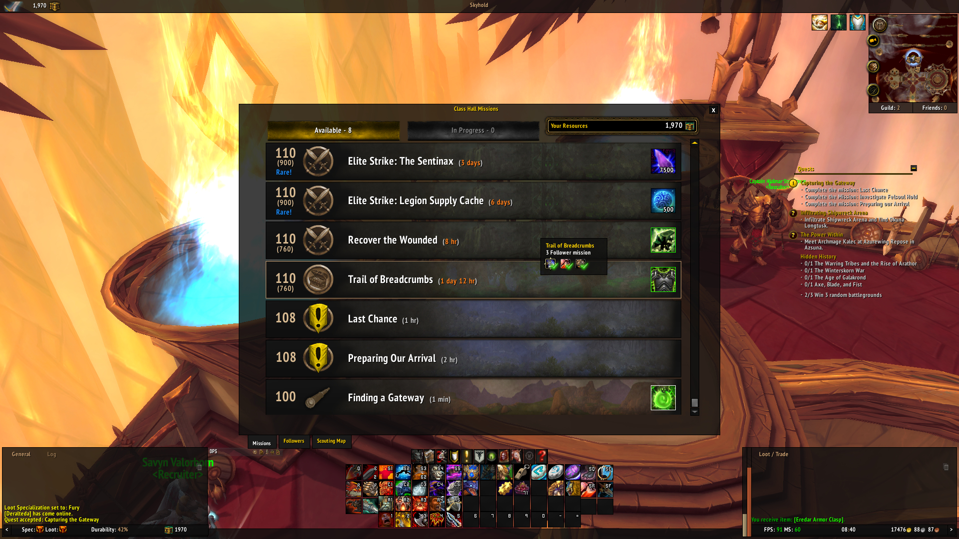 hey, i got the same problem, but it is solved now: http://tracker.legionbugs.com/view.php?id=9053 Your and my hope has been rewarded. The mission appeared. After about 48 hours. So for future requests: 1. "Preparing the Arrival" is immediatly doable. "Last chance" appears, but "bugged". 2. Wait about 48 hours --> "Last chance" succesfull 3. Wait another about 48 hours --> "Investigate Felsoul Hold" appears and can be completed. |
