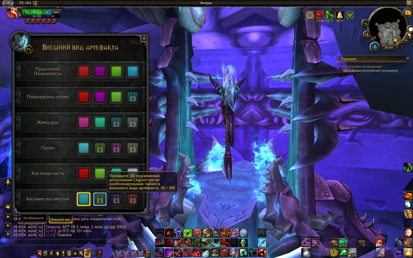 | Description | Проблема следующая на 1 аккаунте 5 персонажей (вар, дк, дх, маг и лок) у всех сделаны скрытые облики арта, Но у вара(Гастро) и дк(Chpokman) не открываются новые расцветки, даже счётчик локалок и подземелий не идёт(персы созданы ещё на 7.0. 5, а когда секретки получил на них уже и не помню) на остальных же всё норм. Как это решить или может возможно обнулить у персов секретки, что б можно было их сделать повторно? | ||||