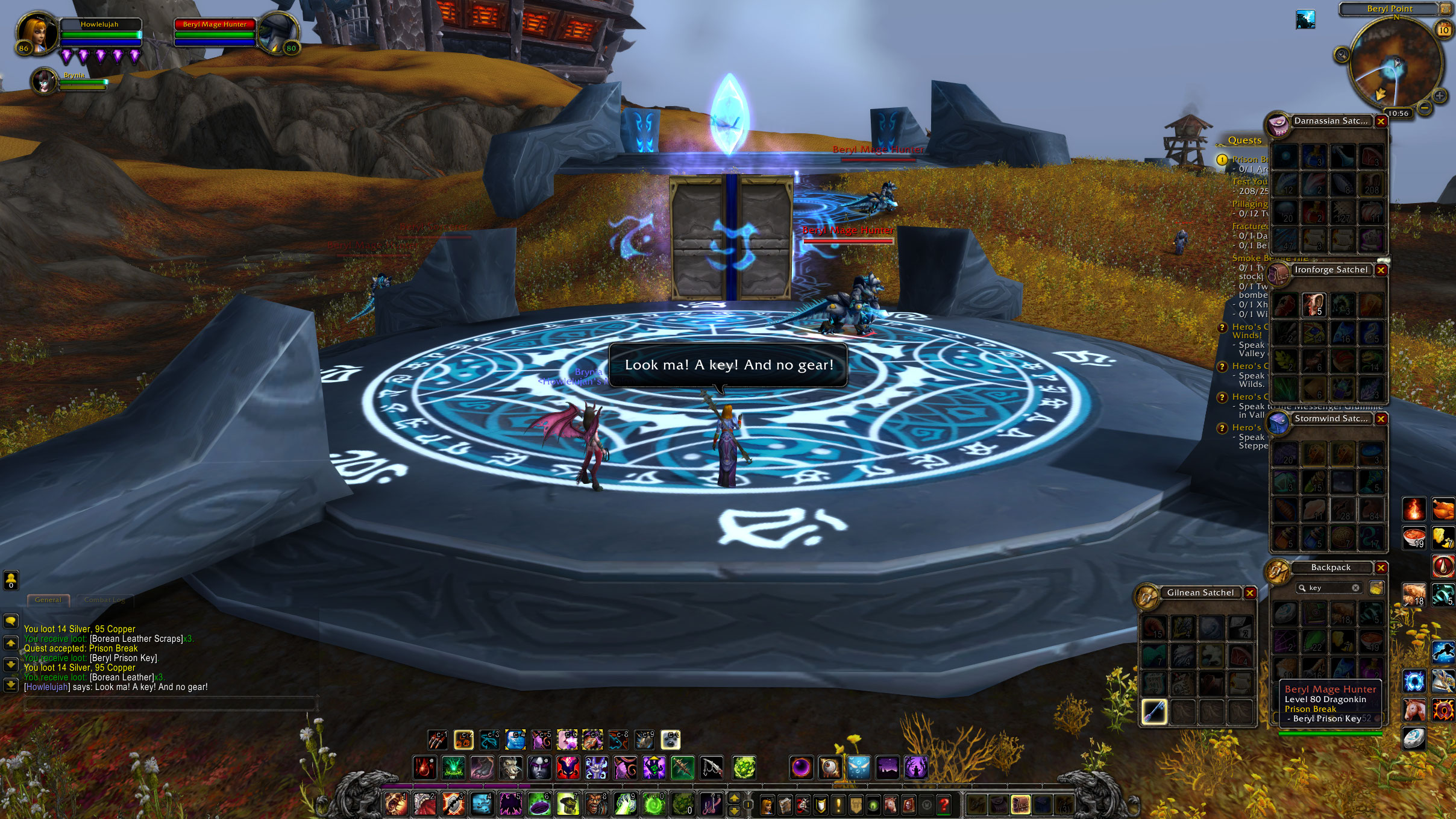 | Steps To Reproduce | https://www.wowhead.com/quest=11587/prison-break Get the quest Kill Mage Hunters until a key drops Go to unlock prisons (any one, or all) Nothing happens, quest cannot complete. Subsequent quests cannot be started. | ||||