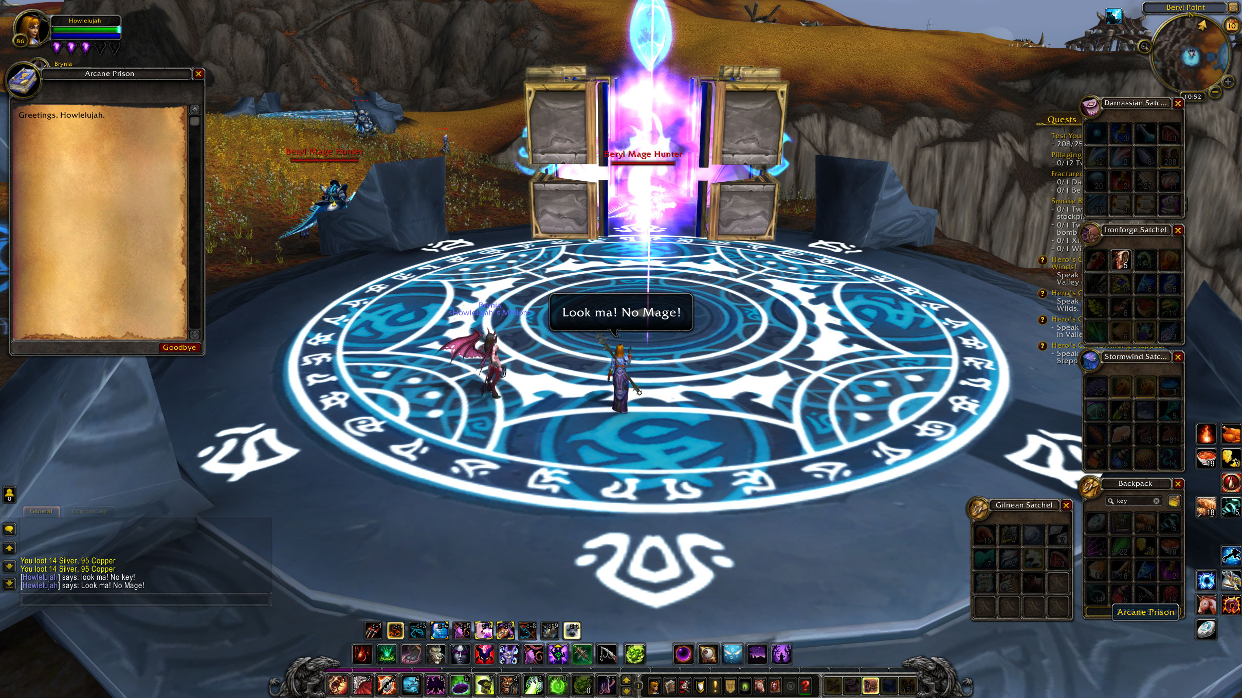 | Description | https://www.wowhead.com/quest=11587/prison-break Get the quest Kill Mage Hunters until a key drops Go to unlock prisons (any one, or all) Nothing happens, quest cannot complete. Subsequent quests cannot be started. | ||||