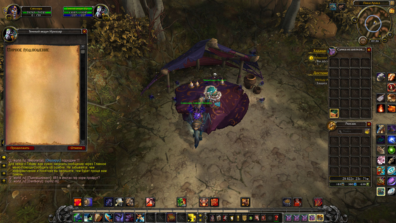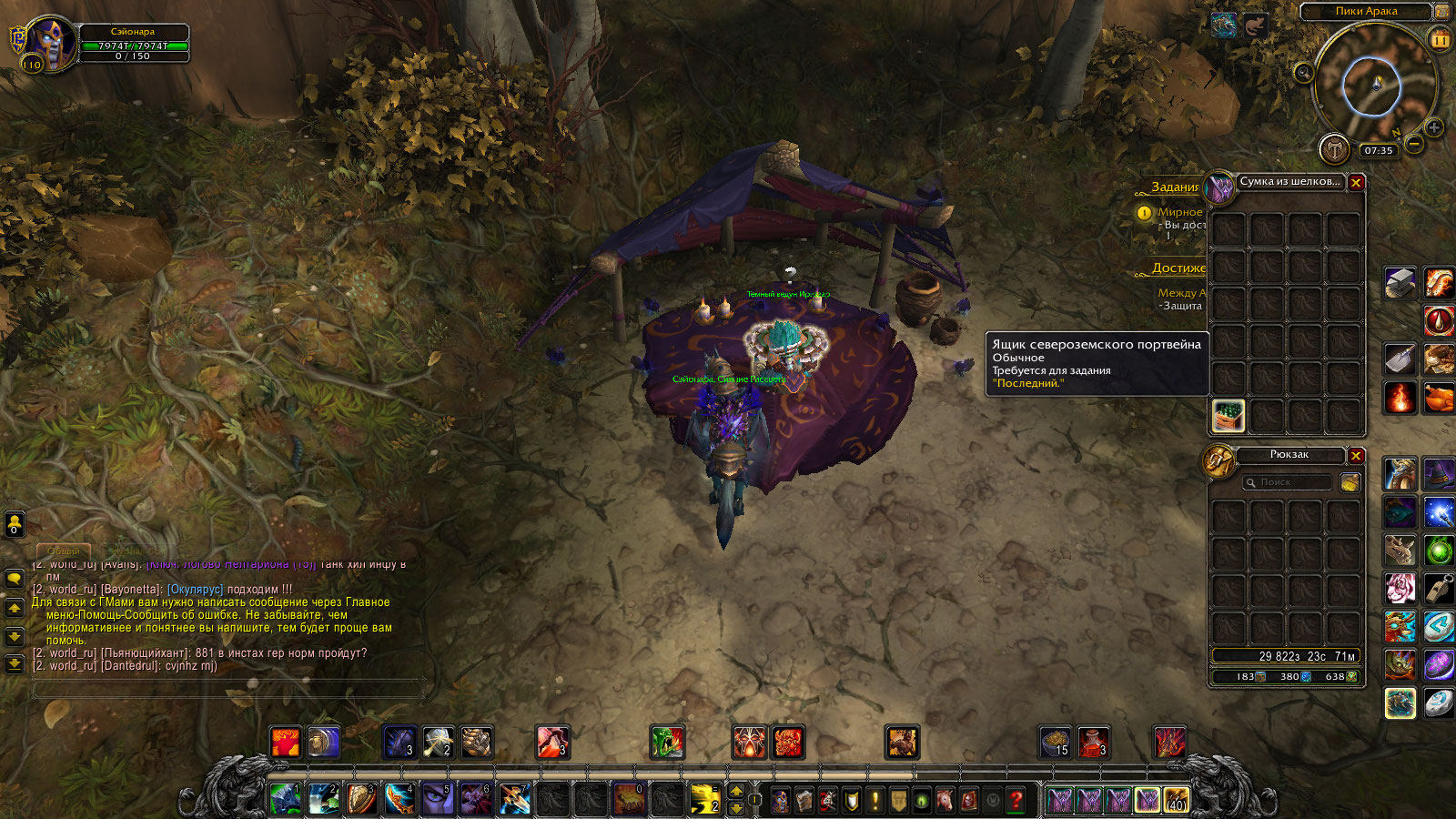 | Description | Для получения достижения -между Араком и наковальней нужно выполнить условие а именно Этап с названием -Защита Южного порта .Для выполнения которого требуеться сделать задания- Защита Южного порта 1. Своих не бросаем (35274) 2. Смотр войск (35276) 3. Какие будут приказы, командир? (35286) 4. Возвращение в Гнездовье Терокк 5. Покушение на убийство 6. Знак убийцы 7. Сила яда 8. Внешняя мотивация 9. Гардул Ядовитый Нож 10. Теперь он попался 11. Времени в обрез И вот как раз на 3 квесте случился затык-Стол выбираетьсяи можно выбрать тип постройки но нажав кнопку НИЧЕГО не происходит и сам стол уходит в ребут минуты на 2-3.И потом снова активен и можно выбирать здание(но мувика с постройкой нет и здание не строиться)а раз не построено здание то нет и продолжения цепочки потому как при постройке ХМЕЛЕВАРНИ на аванпост придет НПС-(83549)Гульда Теневой Клинок и продолжит цепочку заданий.Из комментариев узнал что нужно активировать преквестами а именно у НПС(82709)Милли Осворт-Мирное подношение(35699) и НПС(81929)лейтенант Виллем-Сдружиться с местными(37327)-Милли дает задание тащим ящик к другому НПСу и сраная птица не хочет его принимать точнее у НЕЕ просто отсутсвует завершение задания.А Лейтенант стоит столбиком и вообще больше заданий не дает. | ||||