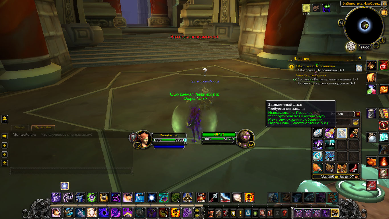 | Description | Не работает квест https://www.wowhead.com/quest=12928/norgannons-shell. Квестовый итем не сумонит моба. После взятия квеста в инвентарь дается итем https://www.wowhead.com/item=44704/charged-disk при использовании которого должен призваться https://www.wowhead.com/npc=29775/archivist-mechaton. | ||||