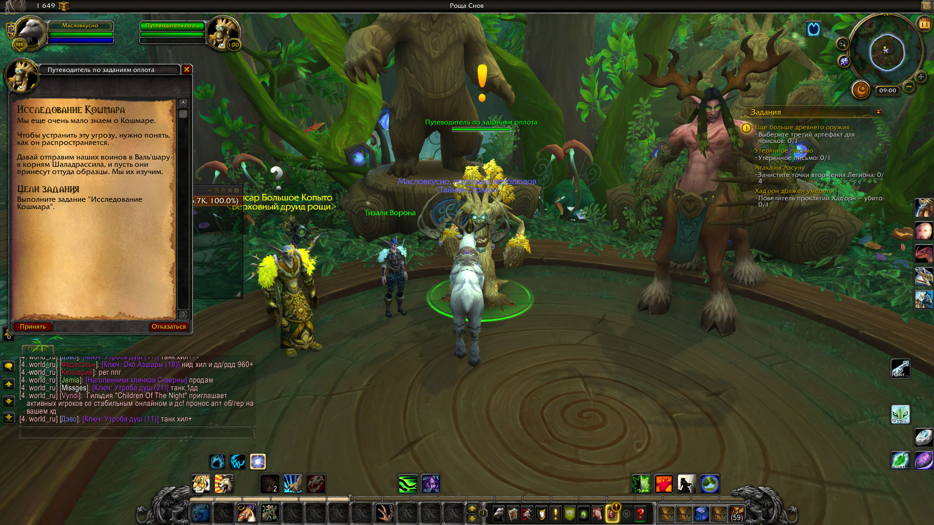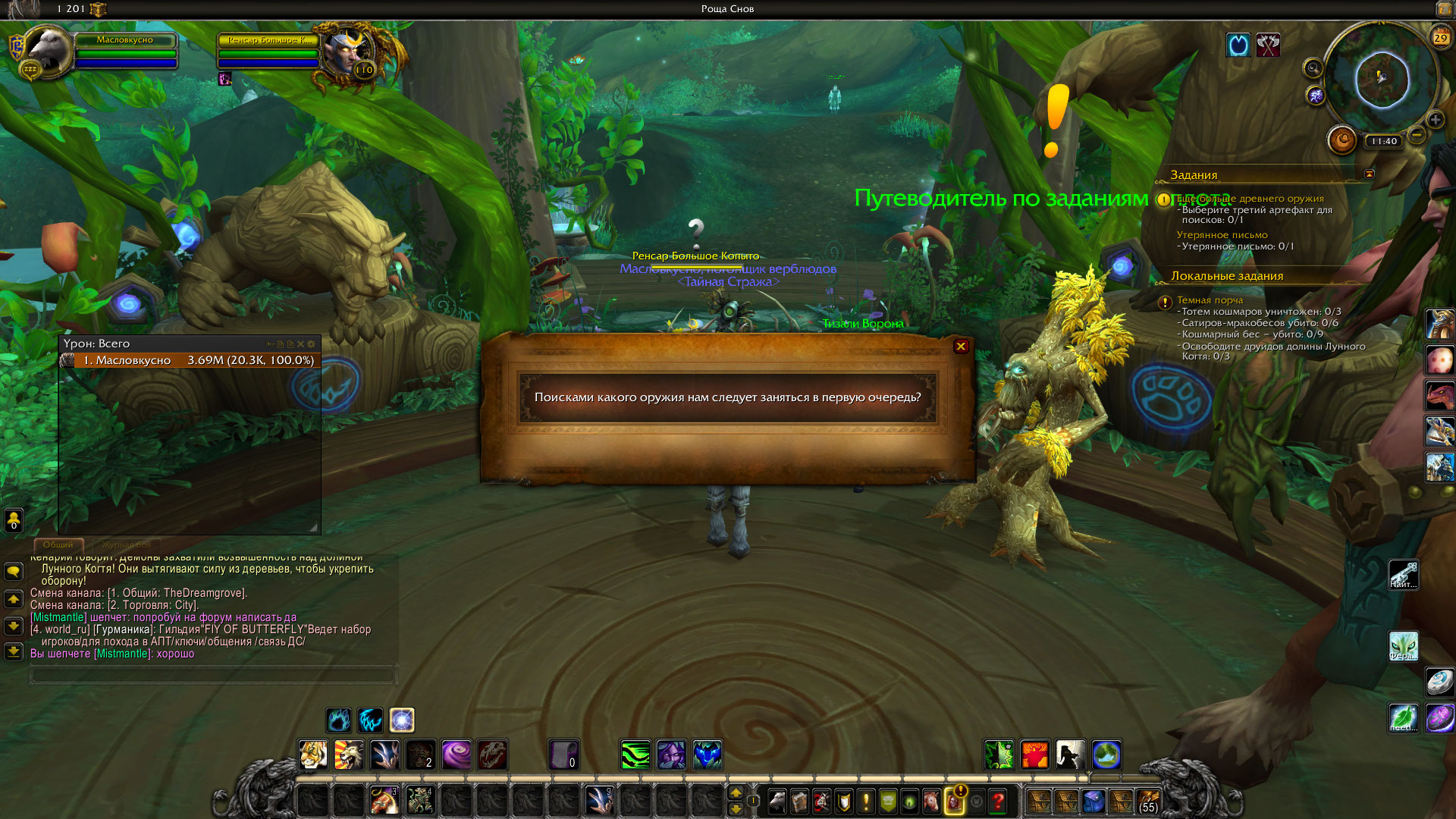 На скриншоте справа торчит дерево с показательным ником "Путеводитель по заданиям оплота" И Это дерево явно что то желает Вам предложить. По части оплота оно дублирует одноименную кнопку в главном меню. Посмотрите что предложит этот нпс и пролистайте путеводитель (на скрине видно, что кнопка подсвечена - там есть новое предложение). И для того, чтобы не шарахаться из крайности в крайность поставьте себе аддон для просмотра квестовых цепочек (это просто) или почитайте вовхед - кампания оплота друида, четыре артефакта и как их получить, какие квесты и где брать (это сложно). Или подождите пока тестер найдет за вас номера квестов и подготовит Вам последовательность команд для проверки. Мне лень. |