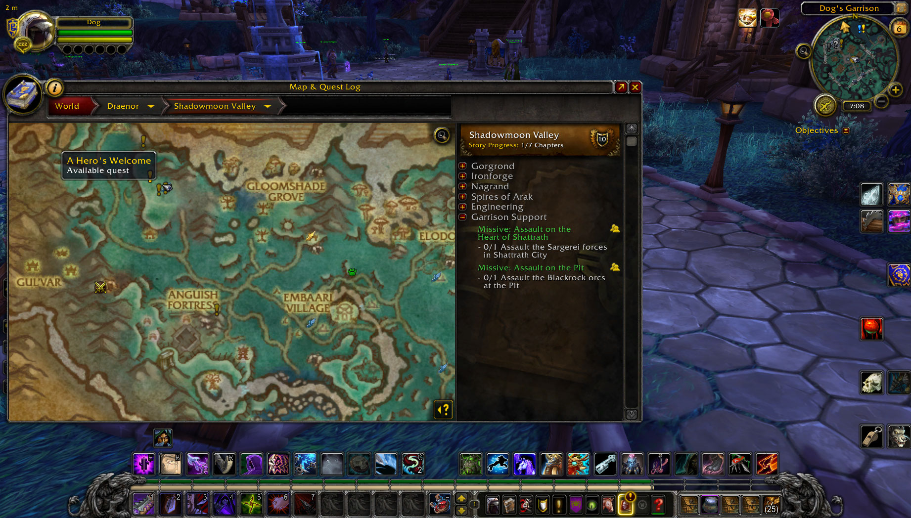 | Description | Character: Dog Realm: Argusx100 Hello. The quest "A Hero's Welcome" in Draenor Shadowmoonvalley id=33075 Is not visible. I have checked everywhere and I do think it's because my garrison is at tier 3. The quest shows it starts at the garrison and can see it on the map which you will see at the screenshot below. Wowhead says "This quest starts in Lunarfall and Shadowmoon Valley and ends in Shadowmoon Valley." I even checked the 2nd location. The NPC also doesn't show up at the 2nd location. (Screenshot below) https://www.wowhead.com/quest=33075/a-heros-welcome | ||||