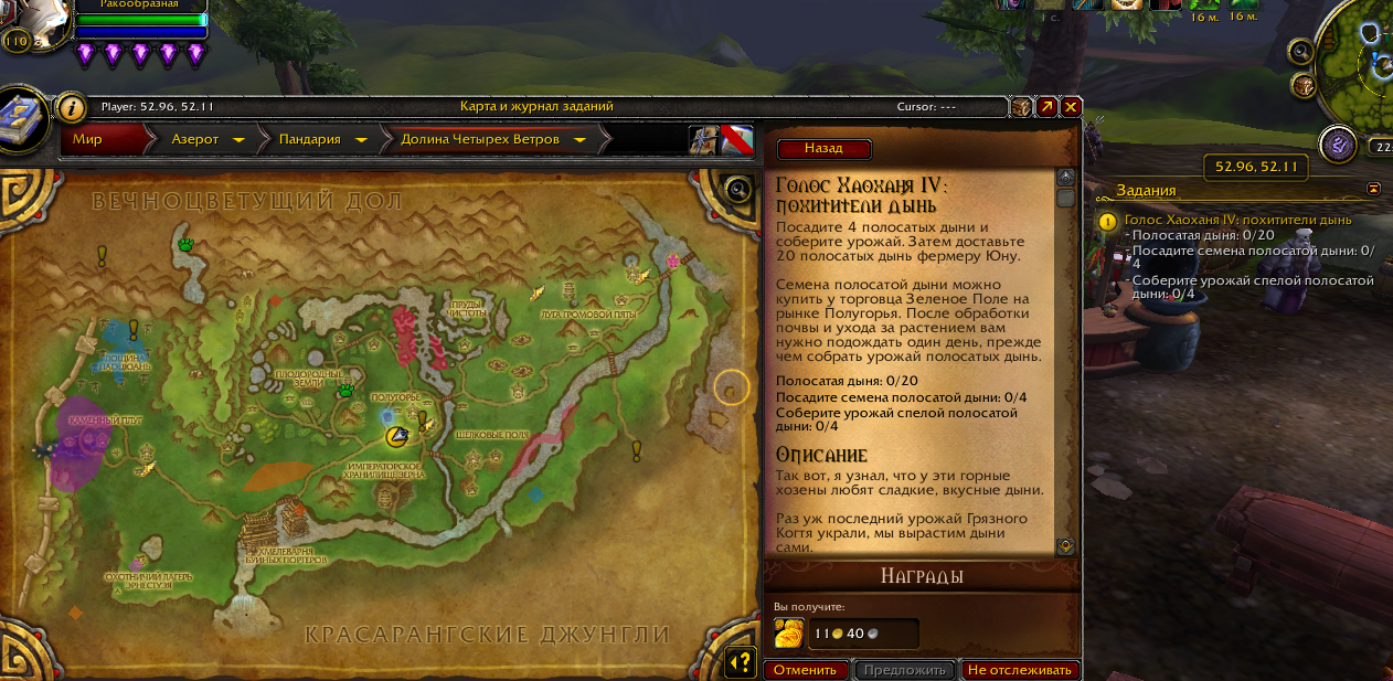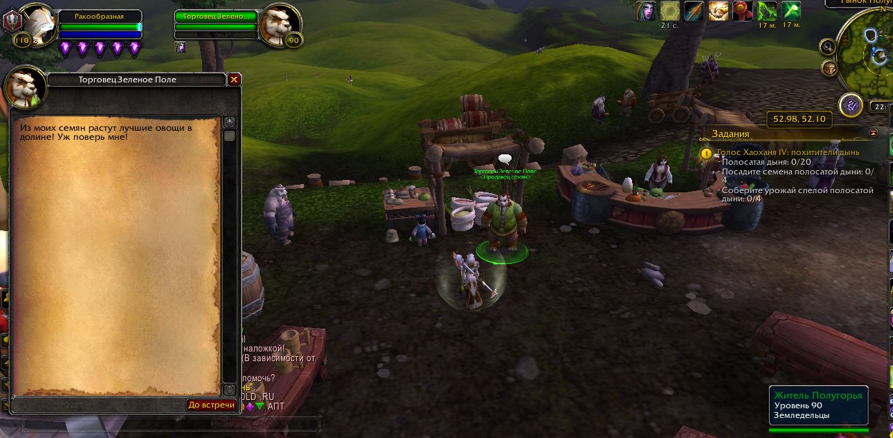 | Description | Есть задания Голос Хаоханя IV: похитители дынь , но НПС который должен продавать семена по квесту , магазин активен, репутация и цепочка квестов пройдена , скирны ниже | ||||