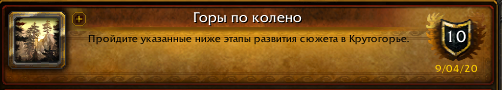В первую очередь https://ru.wowhead.com/quest=39781 , что то мне вспоминается, что помогал пройти инст соГильдийцу, после чего он получил ачивку. Не факт что именно Горы по колено, но что то такое было. |