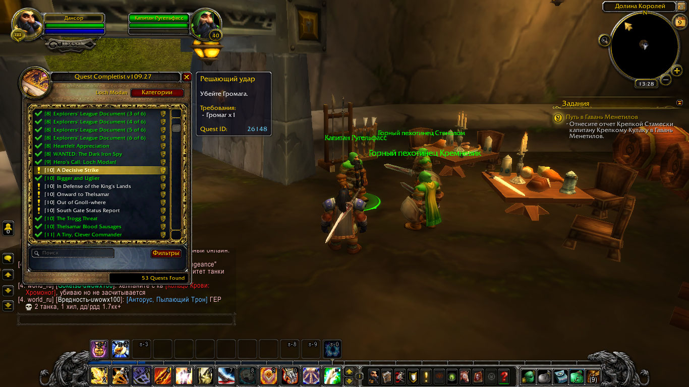 Вот скриншот. Все задания которые я не выполнил в Лок модане их нету в игре добавте их в игру! Я стою возле НПС которий должен давать то самое задание про Громага 26148 и его нету но аддон который вы мне сказали скачять показывает что задание невыполнено просто его нету в игре! |