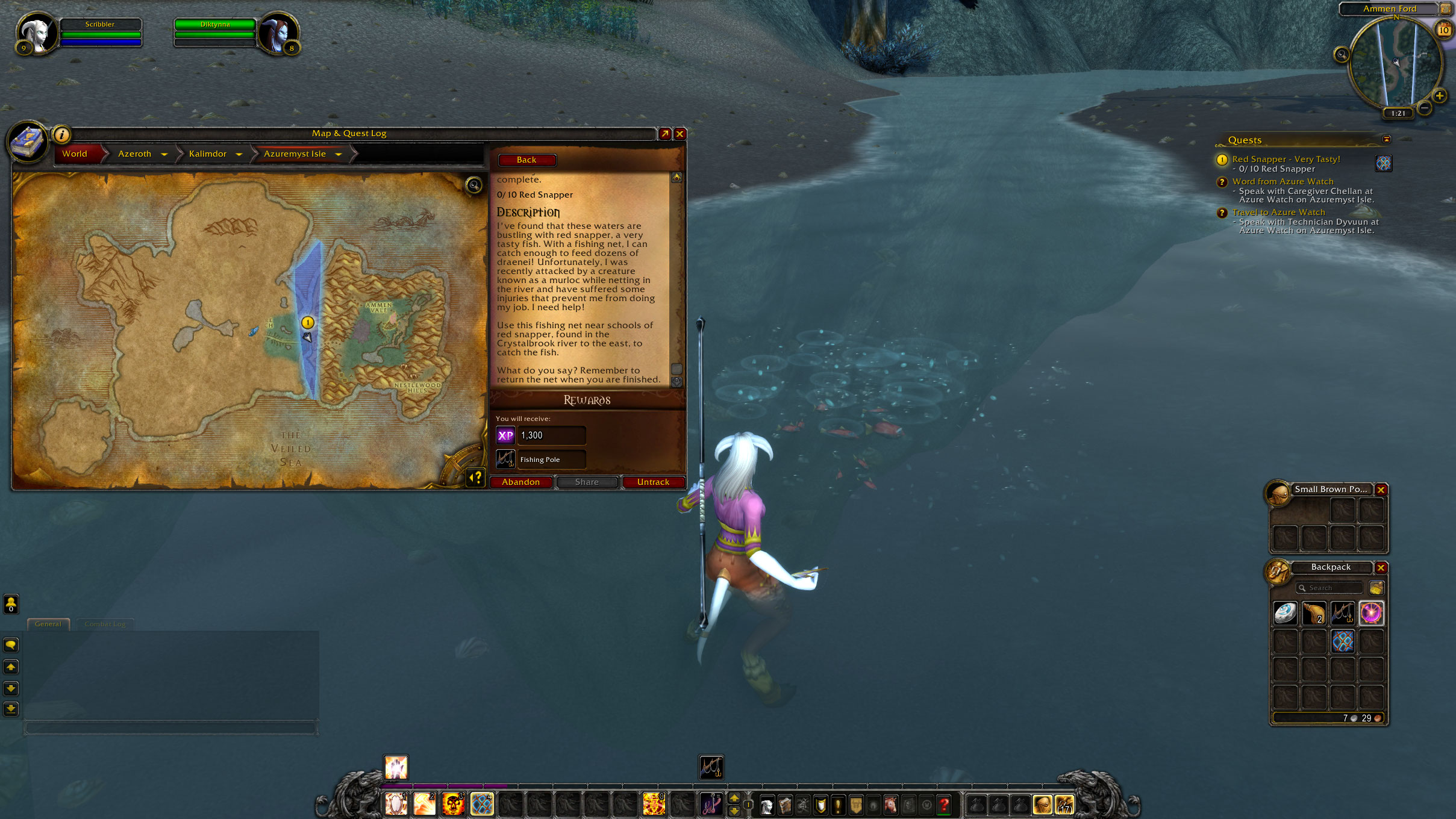 Update: see 0009679 My client did a "silent freeze" where, after submitting the bug, I couldn't abandon the quest, log out the char, nor exit the game. Killed & restarted client, caught 10 red snappers in the same pool, and completed quest. So the point of this bugfind is two-fold: 1: Pool should disappear after being netted, requiring fishing in another pool until 10 are caught 2: No merlocs came to fight me. |