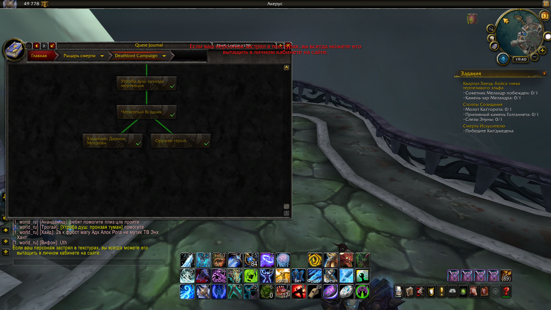 Я сделал всю цепочку дк после выполнения https://ru.wowhead.com/quest=43686 мне дали достижение https://ru.wowhead.com/achievement=10994 http://egammi.net/image/SXDl после выполнения https://ru.wowhead.com/quest=43407 мне дали достижение https://ru.wowhead.com/achievement=10746 http://egammi.net/image/SXDn Теперь перейдем к сути вашего репорта Вы хотите получить достижение https://ru.wowhead.com/achievement=10746? Или выполнить цепочку на расколотом берегу на дополнительного соратника? Посмотрите в аддоне, что у вас не сделано и пришлите скрины http://egammi.net/image/SXDs |