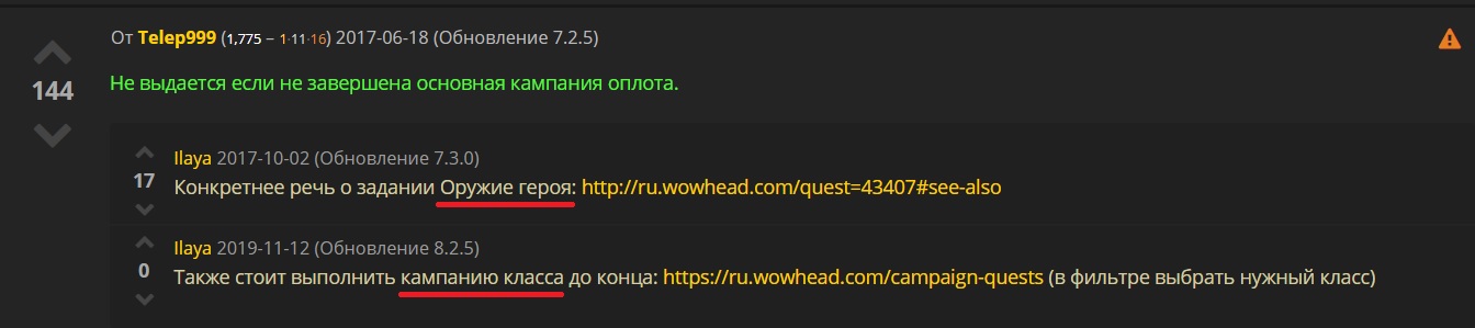 Суть репорта заключается в том, что хотелось бы выполнить цепочку на расколотом берегу, а также на дополнительного соратника в частности. Достижение, также хотелось бы получить, для открытия нового вида артефакта. Как видно из скринов с аддоном, для этого необходим квест "Защитники Армии погибели Легиона" (https://ru.wowhead.com/quest=47137). Данный квест становится доступным после выполнения квеста "Четвертый Всадник" (https://ru.wowhead.com/quest=43686) и "Оружие героя" (https://ru.wowhead.com/quest=43407). Как изначально писал, проблема заключается в квесте "Оружие героя" (https://ru.wowhead.com/quest=43407), так как, насколько я помню, его не выполнял, а он у меня отображается, как пройденный. В связи с этим отсутствует достижение "Закаленный для битвы" (https://ru.wowhead.com/achievement=10746) |