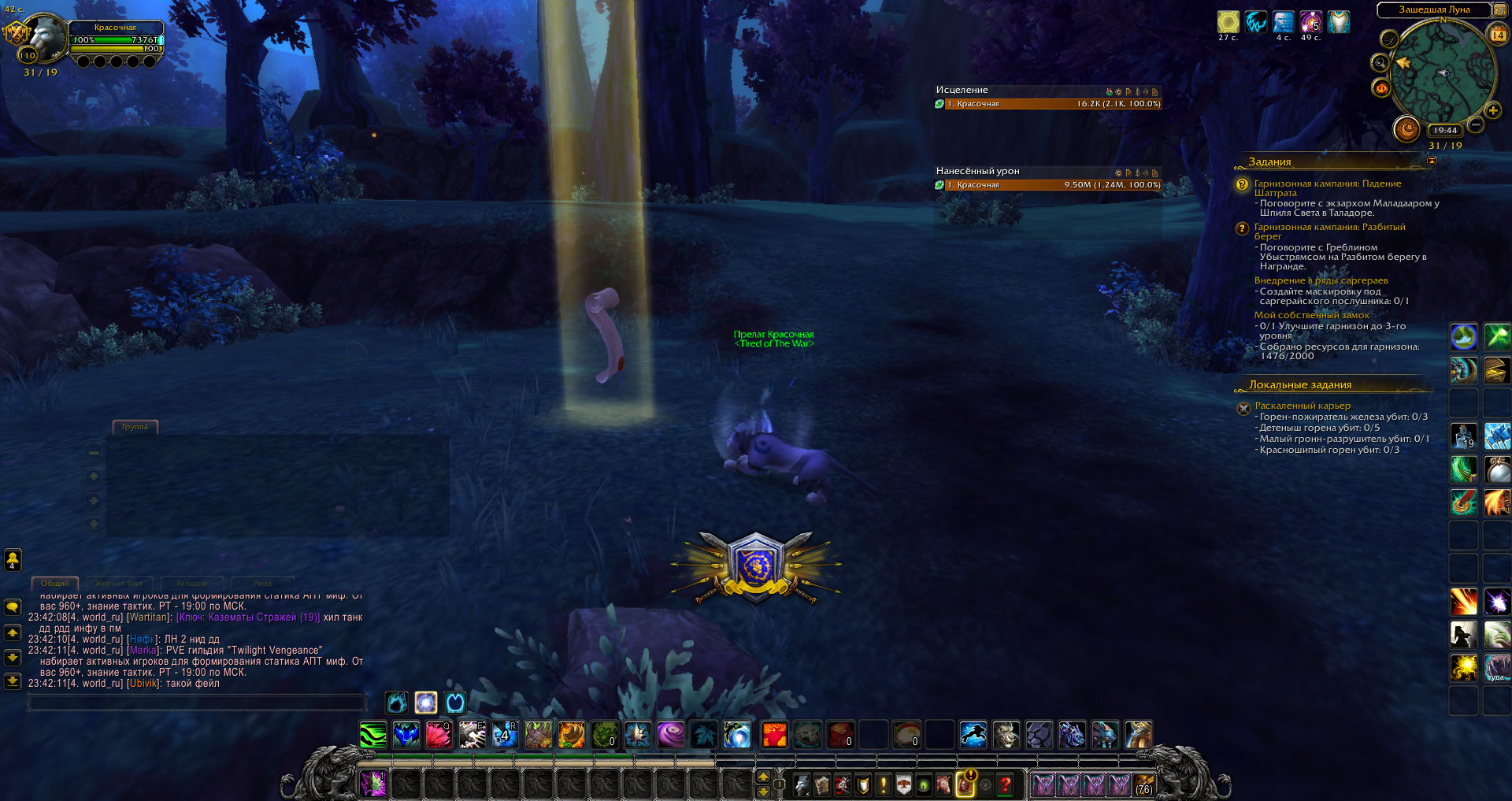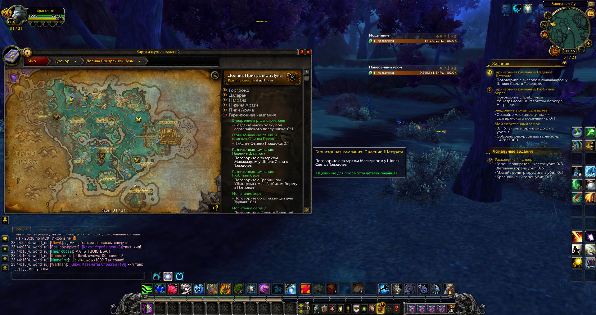 | Description | Проблема в том, что после железного решения сделать полеты на Дреноре, начала развивать и гарнизон, где была куча заданий. Естественно большую часть принялась делать, попутно улучшила гарнизон(часть квестов даже осталась), как я поняла, поскольку он преобразился на радость мне. Поставила на улучшение ратушу, плюс к этому новые постройки в виде Алхимии и стойл. После очередного возвращения через гарнизонный камень поняла, что гарнизон просто испарился и на его месте первоначальный лес. Нашла свиток "Завершения строительства" еле-еле, потому что фаза меняется очень быстро, не ясно почему(появляются и пропадают птицы). Ничего не изменилось. Бегала к берегу высадки по десять раз, где висит задание "За работу!", по итогу просто стоит Велен без квестов. | ||||