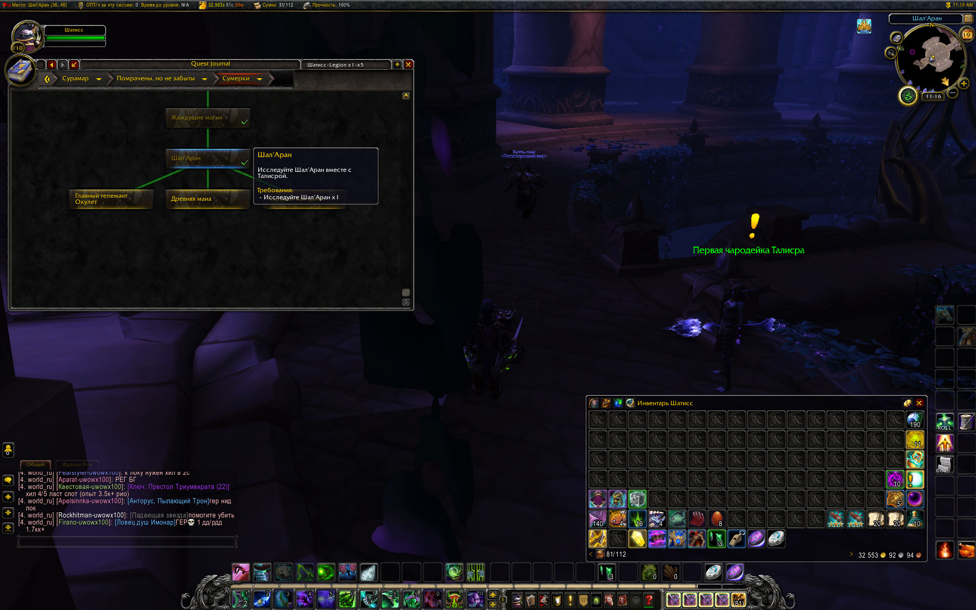 А вот еще один чар. тут сделано на один квест больше и закрыта полностью глава Сумерки. Пришлось по минимуму делать на всех чарах, потому что после недавнего исправления НПС Эллит, за которого говорит Cyberbird , прекратил принимать задание посланника (по оффу в общем то). |
