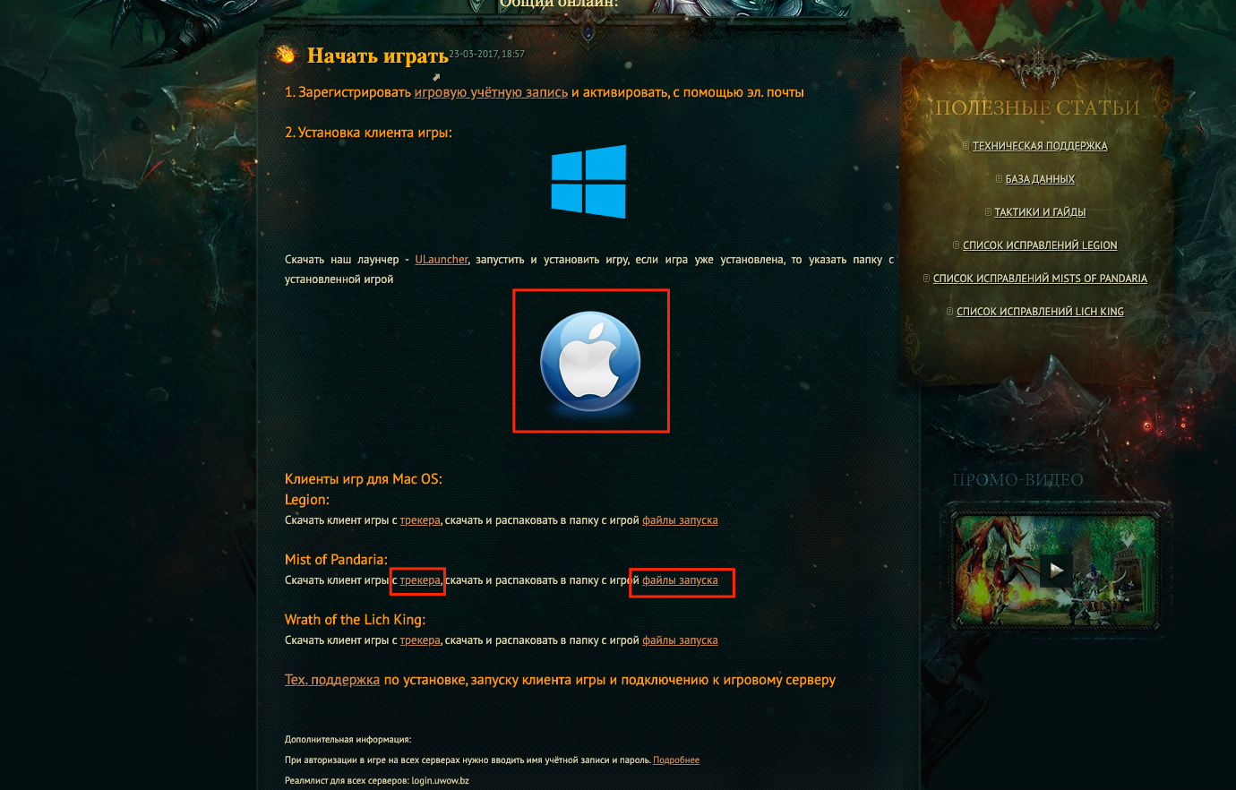 Доброго времени суток. Сегодня я загрузил новую (другую) версию MoP через Лаунчер. Открытие загрузочного файла uWow.exe я открыл через Wine. Работает игра криво, но https://ru.wowhead.com/item=112353/доблестные-деяния действительно работает, и при открытии этого итема действительно начисляется https://ru.wowhead.com/currency=396/очки-доблести. Но если я загружаю файлы которые предназначены для macOS, игра перестает работать (Все их этих вариантов не работают в этом случае http://forum.uwow.biz/topic/291978-problema-s-zapuskom-klienta-na-mac/) Так что единственный рабочий вариант играть это http://tracker.legionbugs.com/file_download.php?file_id=7333&type=bug. И в результате этого https://ru.wowhead.com/item=112353/доблестные-деяния не работает. "Замкнутый круг" какой то... Может быть у Вас еще имеются какие то мысли как выйти (решить) из этой проблемы. Заранее Спасибо |