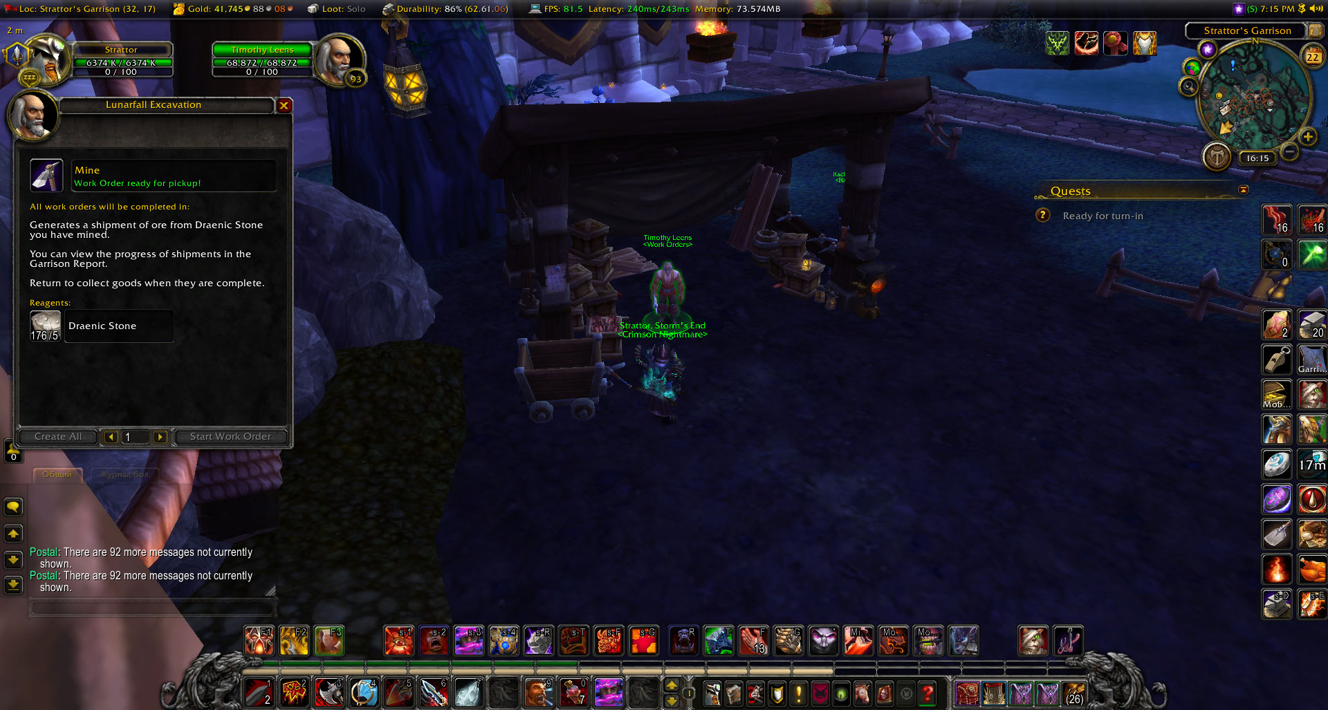 | Description | There are a few bugs envolving the Lunarfall Mines. At level 1, seems to work fine, but when you upgrade to level 2, it should increase the mine's size, and with that comes the first bug I've found: The textures of Level 2 are just overplaced the Level 1 mines textures, which means you get video glitches, as you technically are in two different mines at the same time and at the same place. The same occurs with the level 3 mines, but with more visual bugs. Also, the leve 3 Mines, don't produce any Blackrock or True Iron deposits, which means the mines are completelly useless at this point. There is a bug with Mines level 3 Work Orders, which allows you to put the work order, but do not allow you to collect them. So after you put all 24 work orders, you can't do anything else, it stucks like that. | ||||