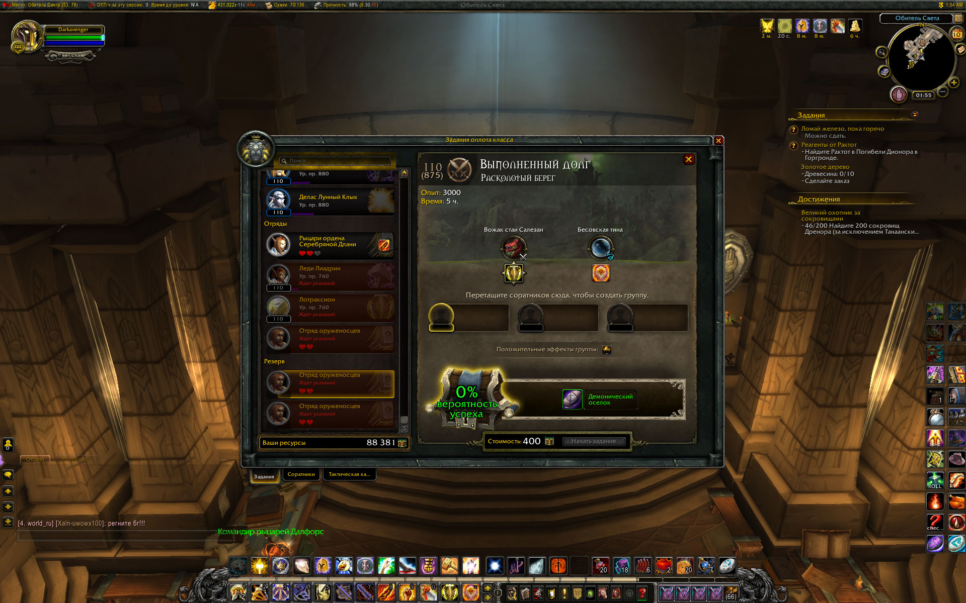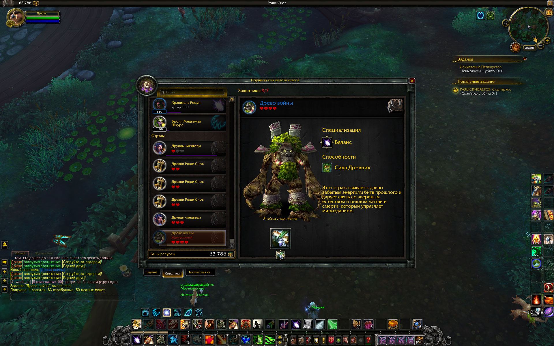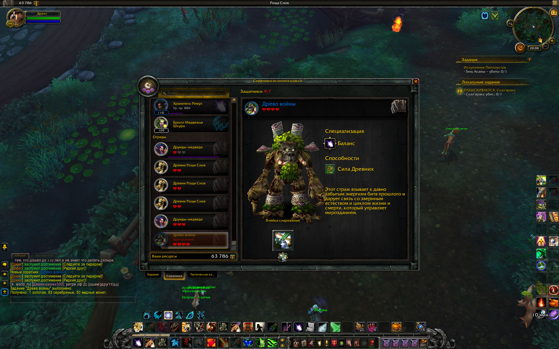 Сегодня в оплоте друида завершилось обучение Древа Войны. Соратник редкого качества, присутствует ячейка для улучшения, заполненная Начертанием и с подписью - возможность делать дополнительные заказы в инженерной мастерской. Пишу как есть :) . Сразу после получения он запрыгнул в конец списка наемных отрядов с пометкой "Ждет указаний" и без возможности добавить его в состав группы для выполнения миссии. Нужно еще сказать, что на момент прибытия друида в оплот были завершены три задания и все девять соратников оказались снова в строю. Прожимал кнопку скриншота, но список выполненных заданий не зафиксировался. После отправки в резерв двух соратников, один из них вместе с Древо Войны оказались в резерве, второй соратник пополнил список наемных отрядов. Но на Древо Войны сработала команда Вернуть в строй. И в результате Древо оказалось в списке отрядов, а второй соратник спрыгнул вниз в список резерва. После этих манипуляций получилось запустить на выполнение имеющуюся миссию, включив в состав группы Древо Войны. В основном, ситуация с неправильным расположением отрядов и соратников, с самовольным возвращением соратников из резерва частично исправилась. То есть массового характера эти явления не имеют. Хотя на паладине и на монахе все девять соратников вернулись в строй, и при этом никакие миссии не были запущены на выполнение. Провал наемных отрядов с одновременным возвратом всех соратников в строй наблюдал только на шамане, пару недель назад, но так как миссий для старта не было , то и не делал никаких попыток исправить. И практически на всех чарах (где это случалось) исчезли дубли наемных отрядов из списка, число которых доходило до 8 отрядов одного типа с нулевым количеством жизней. Сейчас этого нигде нет. |