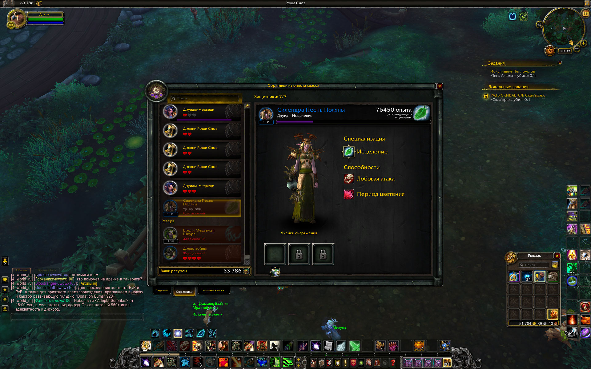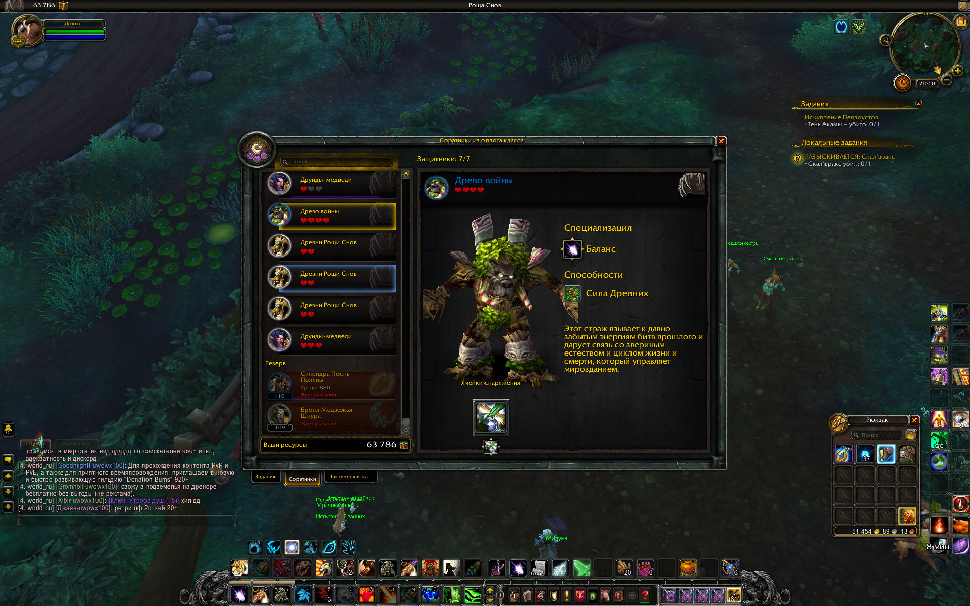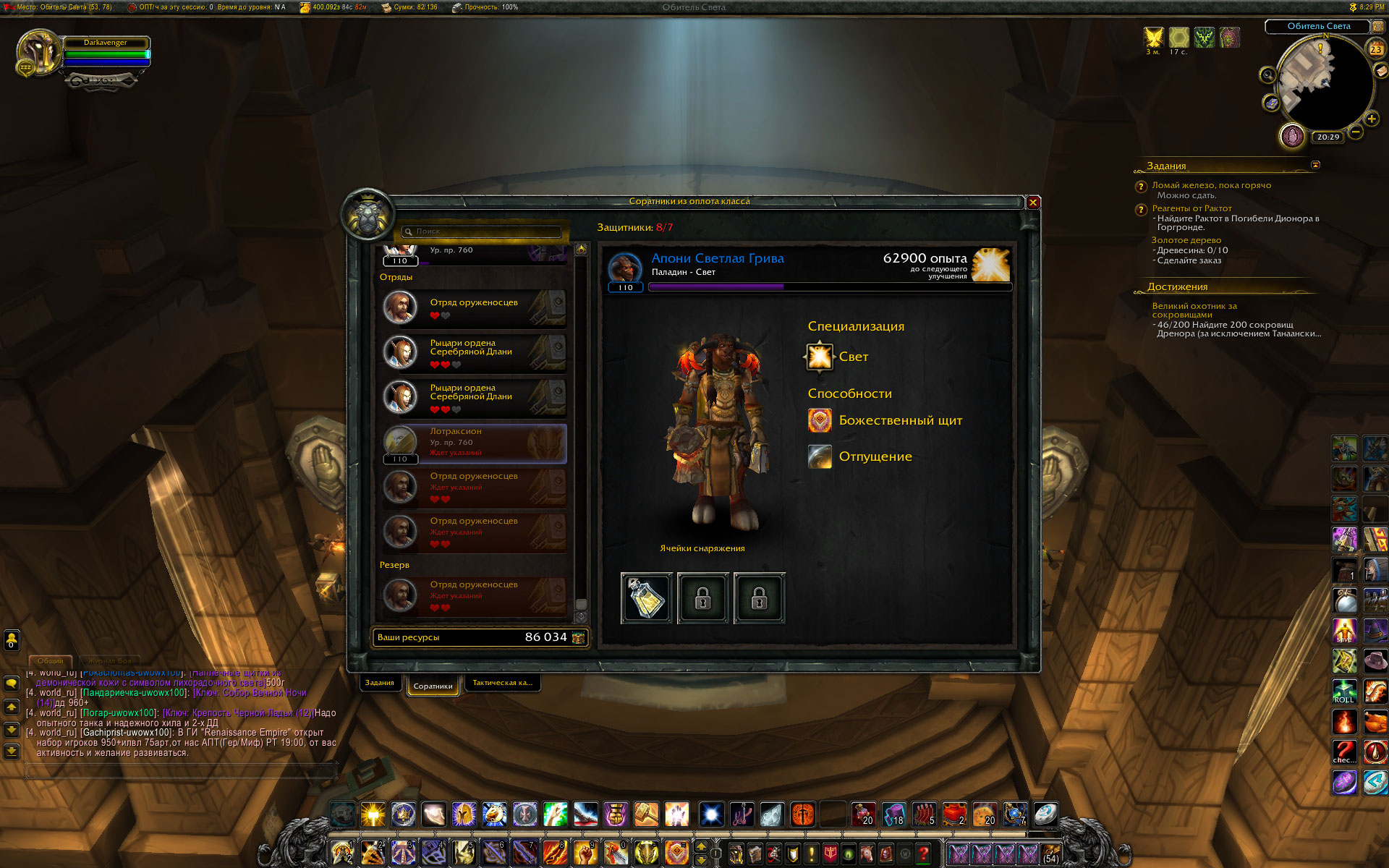Сегодня в оплоте друида завершилось обучение Древа Войны. Соратник редкого качества, присутствует ячейка для улучшения, заполненная Начертанием и с подписью - возможность делать дополнительные заказы в инженерной мастерской. Пишу как есть :) . Сразу после получения он запрыгнул в конец списка наемных отрядов с пометкой "Ждет указаний" и без возможности добавить его в состав группы для выполнения миссии. Нужно еще сказать, что на момент прибытия друида в оплот были завершены три задания и все девять соратников оказались снова в строю. Прожимал кнопку скриншота, но список выполненных заданий не зафиксировался. После отправки в резерв двух соратников, один из них вместе с Древо Войны оказались в резерве, второй соратник пополнил список наемных отрядов. Но на Древо Войны сработала команда Вернуть в строй. И в результате Древо оказалось в списке отрядов, а второй соратник спрыгнул вниз в список резерва. После этих манипуляций получилось запустить на выполнение имеющуюся миссию, включив в состав группы Древо Войны. В основном, ситуация с неправильным расположением отрядов и соратников, с самовольным возвращением соратников из резерва частично исправилась. То есть массового характера эти явления не имеют. Хотя на паладине и на монахе все девять соратников вернулись в строй, и при этом никакие миссии не были запущены на выполнение. Провал наемных отрядов с одновременным возвратом всех соратников в строй наблюдал только на шамане, пару недель назад, но так как миссий для старта не было , то и не делал никаких попыток исправить. И практически на всех чарах (где это случалось) исчезли дубли наемных отрядов из списка, число которых доходило до 8 отрядов одного типа с нулевым количеством жизней. Сейчас этого нигде нет. |