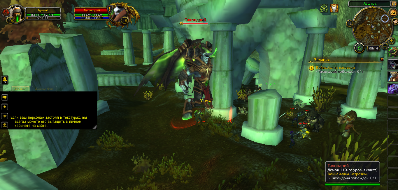 | Description | Ку! Я проходил сюжетку крутогорья. По цепочке квеста я попал на остров Азшара, и там есть квест убить Тихондрия. Когда я первый раз его взял все было нормально, я его начал бить, но резко сервер дисконектиться и все, я вылетаю. Я перезахожу на сервер спустя несколько минут, и я не могу его бить. По нему мои умения летят мимо. Еще он стоит не там где должен. Помогите пж. Ник в игре IgarenI | ||||
